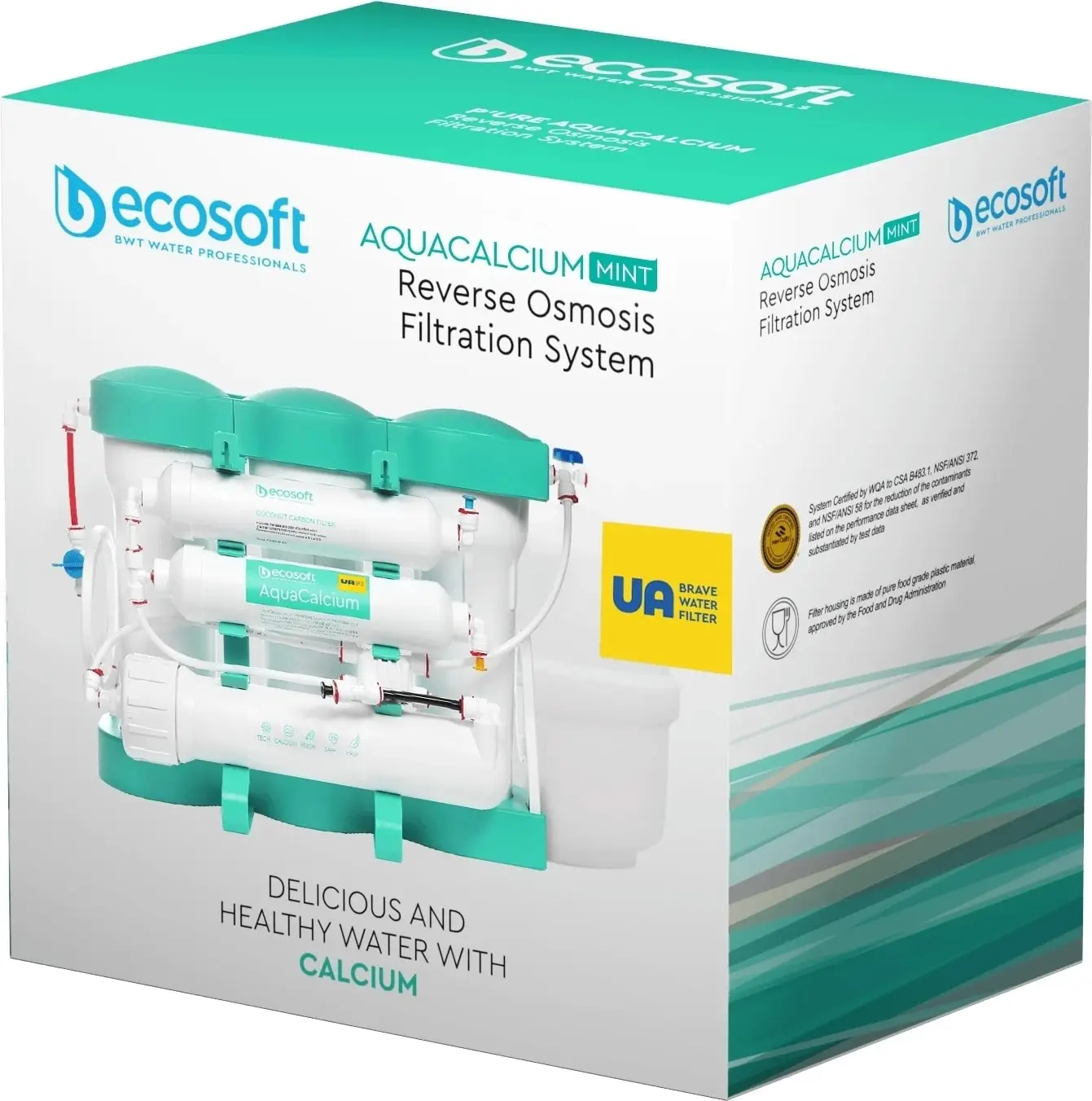Новітня система зворотного осмосу Ecosoft P'URE AquaCalcium Mint - поєднує в собі передові розробки в сфері очищення води і сучасний дизайн, який прикрасить собою будь-яку кухню. Завдяки шестиступінчастій системі очищення і поліпшеною мінералізації води ви будете надійно захищені від згубного впливу неякісної води.
