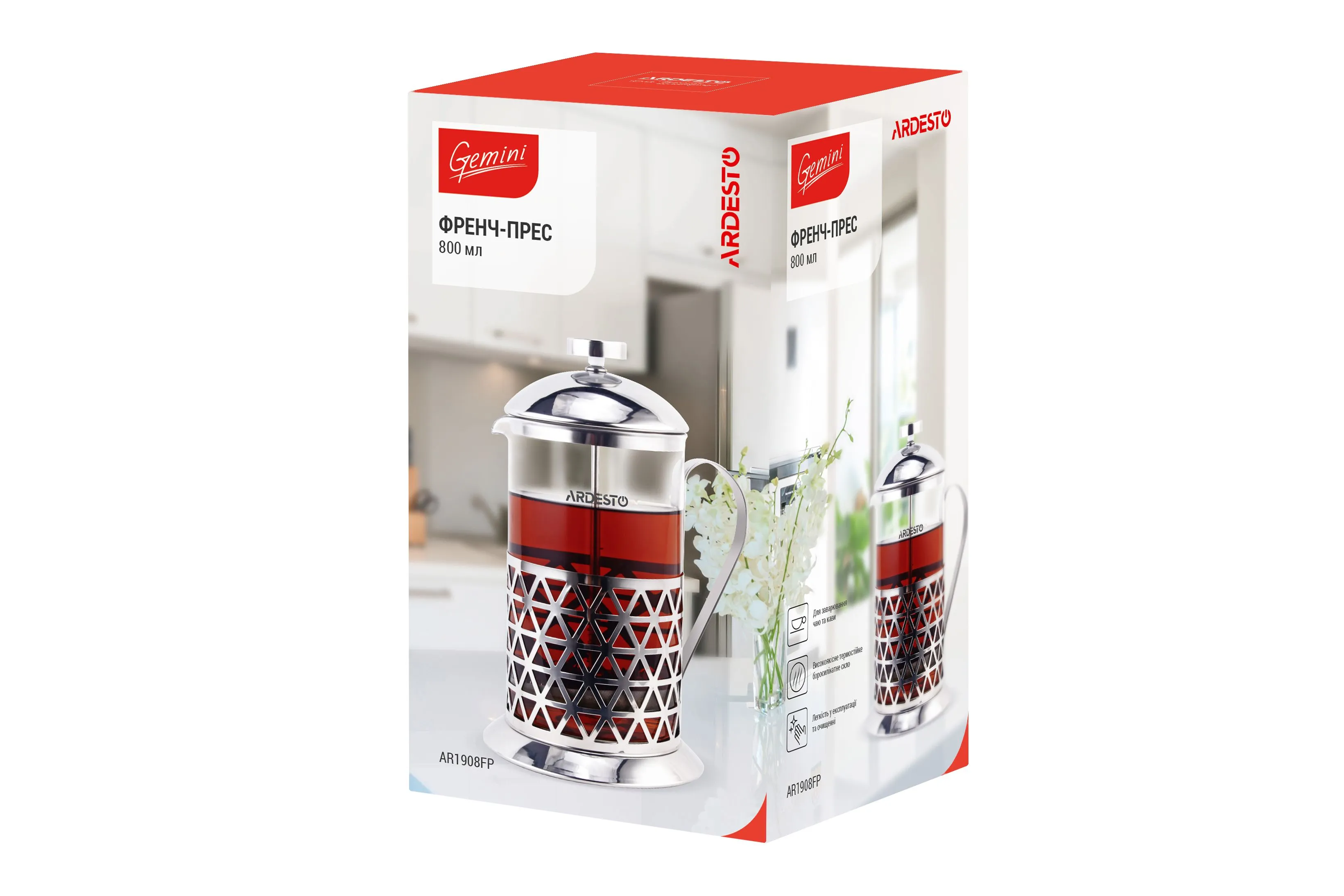 Френч-прес Ardesto Gemini Fasano, 800мл, боросилікатне скло, нержавіюча сталь, прозорий