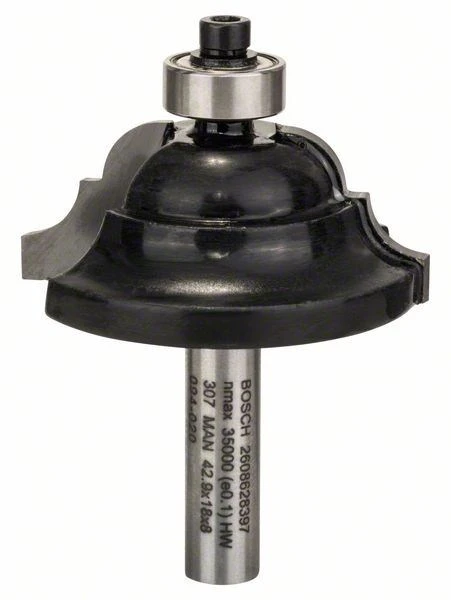Профільна фреза D з хвостовиком 8 мм, шириною 15 мм, робочою довжиною 18 мм та загальною 60 мм, з радіусом 6,3 мм — практична робоча насадка для вертикального фрезера при виконанні столярних робіт. Виготовлена з твердого сплаву, з двома лезами та шарикопідшипником, фреза оптимально підходить для обробки кромок деталей, виготовлення різних обкантовок.