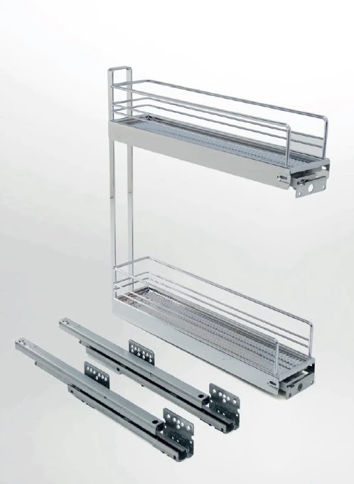 Фронтальний висувний 2 поверховий комплект шафи Classic з 2 корзинами та механізмом повного висуву з системою SoftStopp. Висувний комплект виготовлений з хромованої сталі, та призначений для для внутрішньої висоти корпусу до 540 мм, внутрішньої ширини корпусу до 112 мм, несуча здатність кожної полиці по 6 кг. Розмір корзини: ширина 104 мм, глибина 465 мм, висота 37 мм.