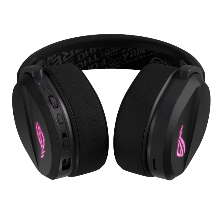 Ігрова гарнітура з трирежимним RGB-підключенням, оснащена бездротовою технологією ROG SpeedNova, 50 мм динаміками з титановим покриттям від ROG, удосконаленим звуковим підписом для бездротового підключення, 10 мм широкосмуговим мікрофоном, полегшеним дизайном вагою 309 г і підсвіткою ASUS Aura Sync RGB