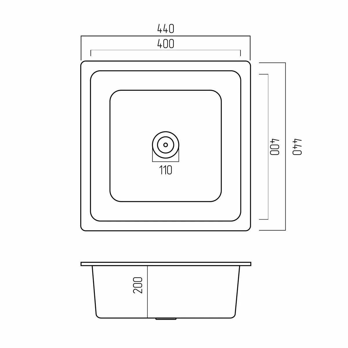 Завдяки своїм компактним розмірам - довжина 440 мм і ширина 440 мм,глибина 200мм- ця мийка ідеально підходить для невеликих кухонь, де кожен дюйм простору цінний. Квадратна форма додає сучасності та гармонію у дизайні.Розмір чаші 400х400х200мм.