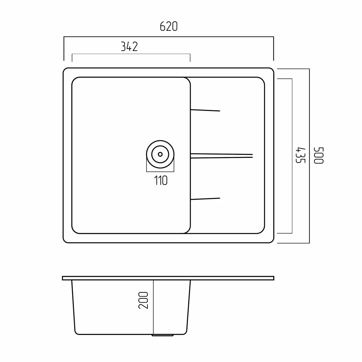 Завдяки своїм компактним розмірам - довжина 620 мм і ширина 500 мм,глибина 200мм- ця мийка ідеально підходить для невеликих кухонь, де кожен дюйм простору цінний. Квадратна форма додає сучасності та гармонію у дизайні.Розмір чаші 342x435x200мм.