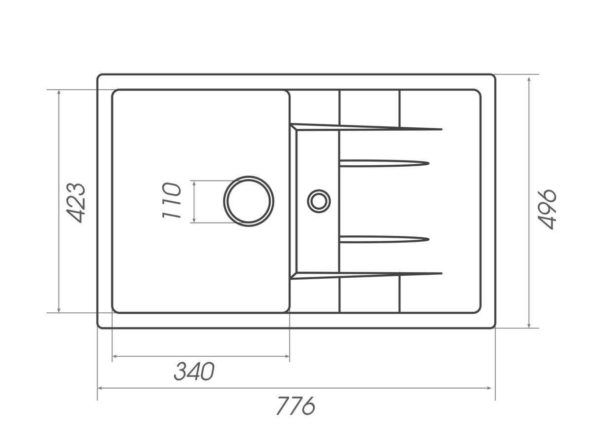 Розміри мийки – 776x496х180 мм, вага – 13.3 кг, сифон – євросифон з широкою горловиною, 110 мм.