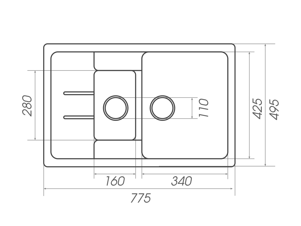 Розміри мийки – 775x495х190 мм, вага – 13.5 кг, сифон – євросифон з широкою горловиною, 110 мм.