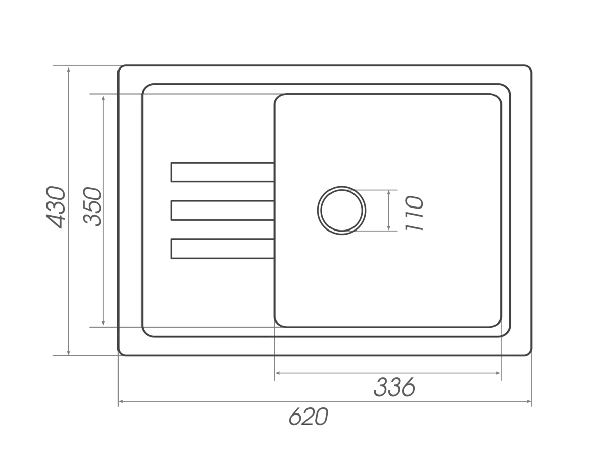 Розміри мийки – 620х430х190 мм, вага – 9 кг, сифон – євросифон з широкою горловиною, 110 мм.