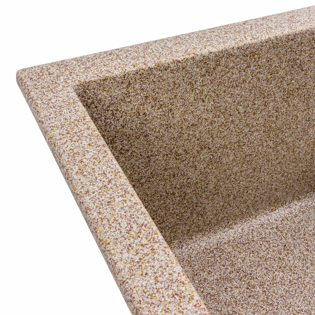 Ця мийка виготовлена за допомогою технології Solid Surface, що гарантує її якість і довговічність. Цей матеріал виготовляється методом лиття, і в ньому поєднуються 80% кварцевого піску та 20% смоли. Візуально він нагадує природний камінь, а його поверхня є теплою і шовковистою на дотик.