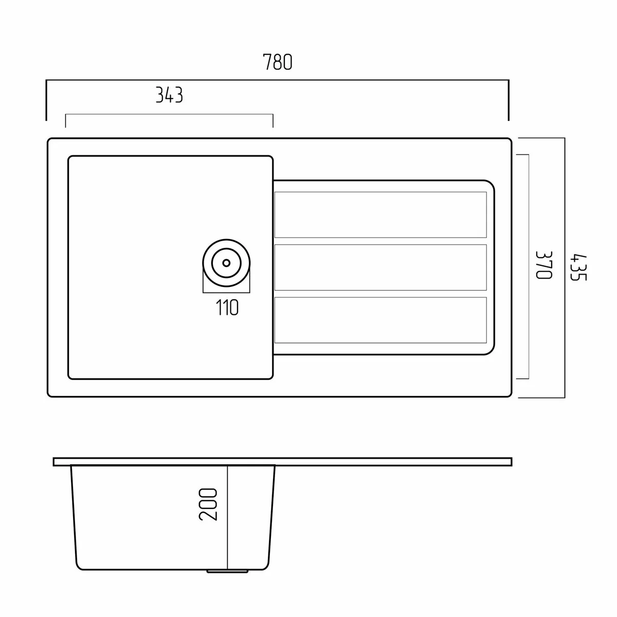 Розмір мийки 780х435х200мм робить її ідеальною для будь-якої кухні, а розмір чаші 343х370х200мм забезпечить комфорт при використанні. Мийка має врізний дизайн для бездоганного поєднання з вашою стільницею, надаючи вашій кухні стильність та оригінальність.