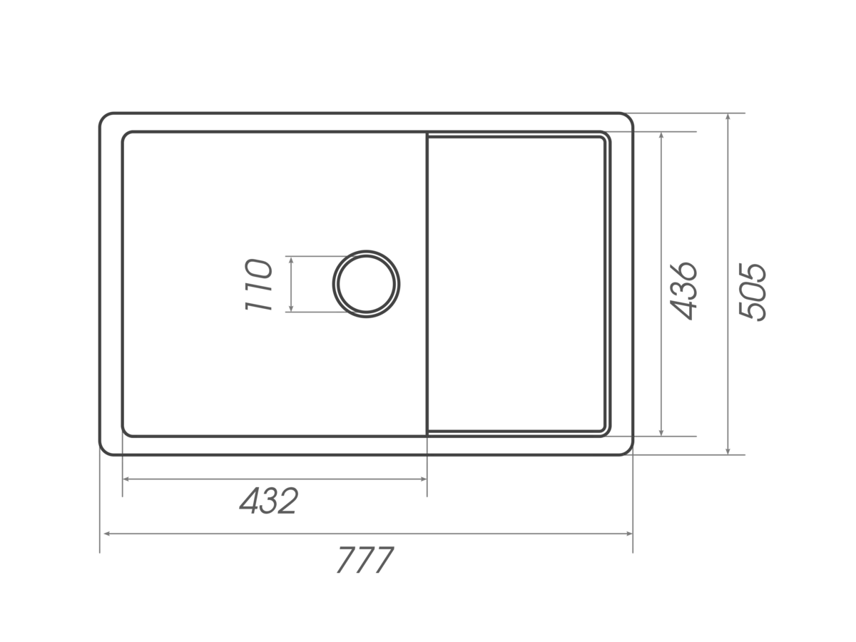 Розміри мийки – 777х505х180 мм, вага – 14,5 кг, сифон – євросифон з широкою горловиною, 110 мм.