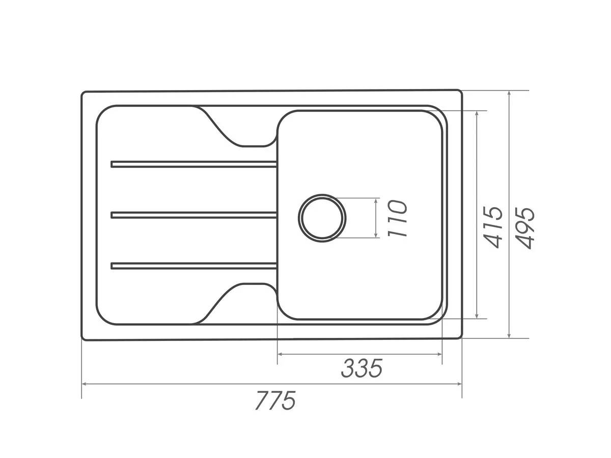 Розміри мийки – 775х497х180 мм, вага – 12 кг, сифон – євросифон з широкою горловиною, 110 мм.