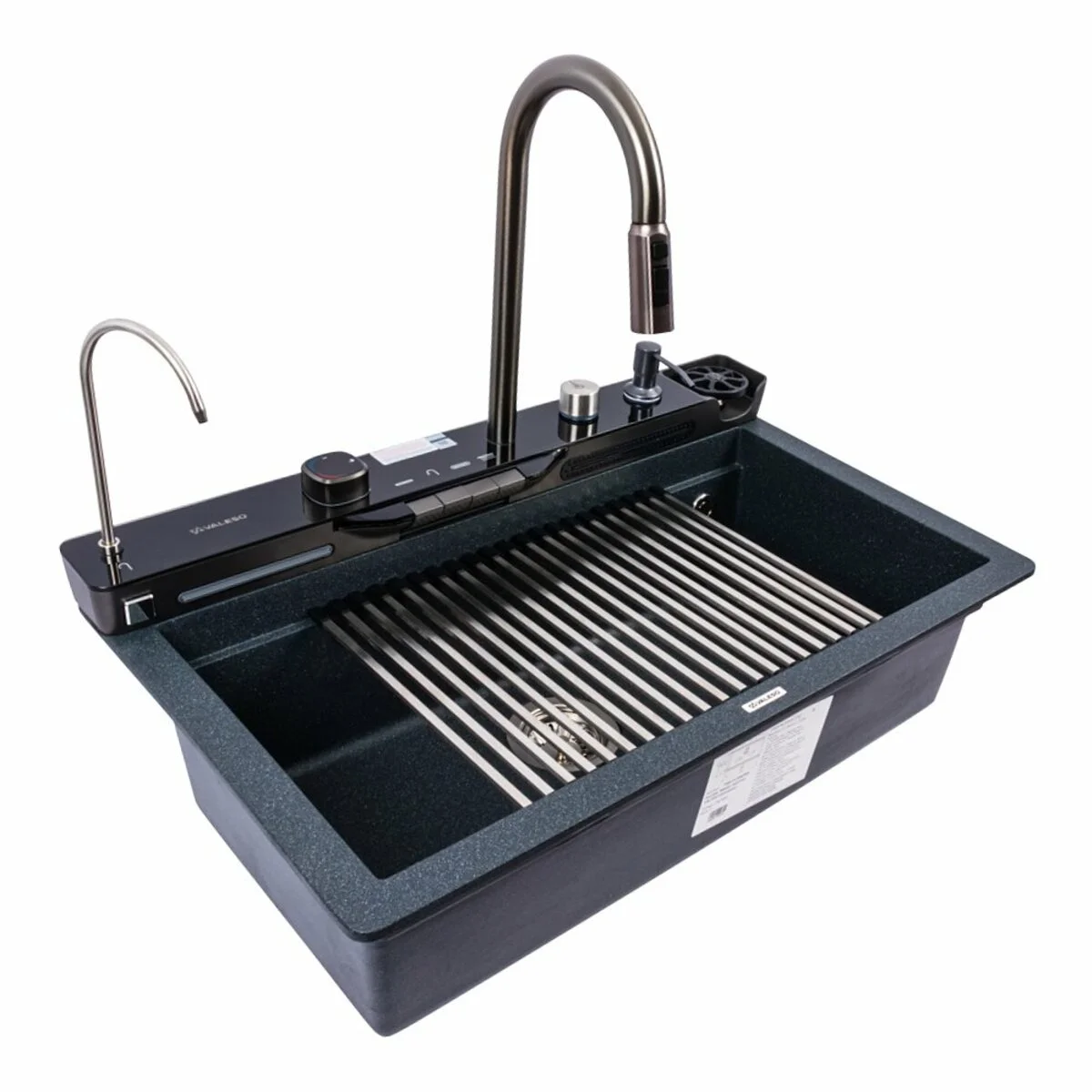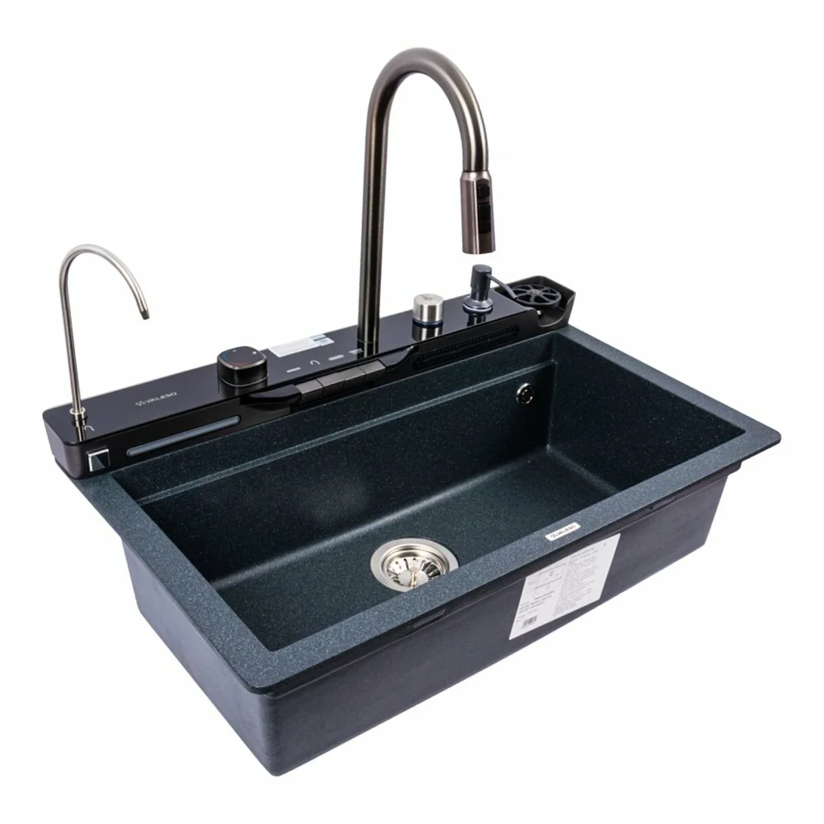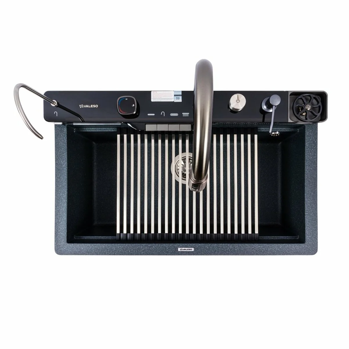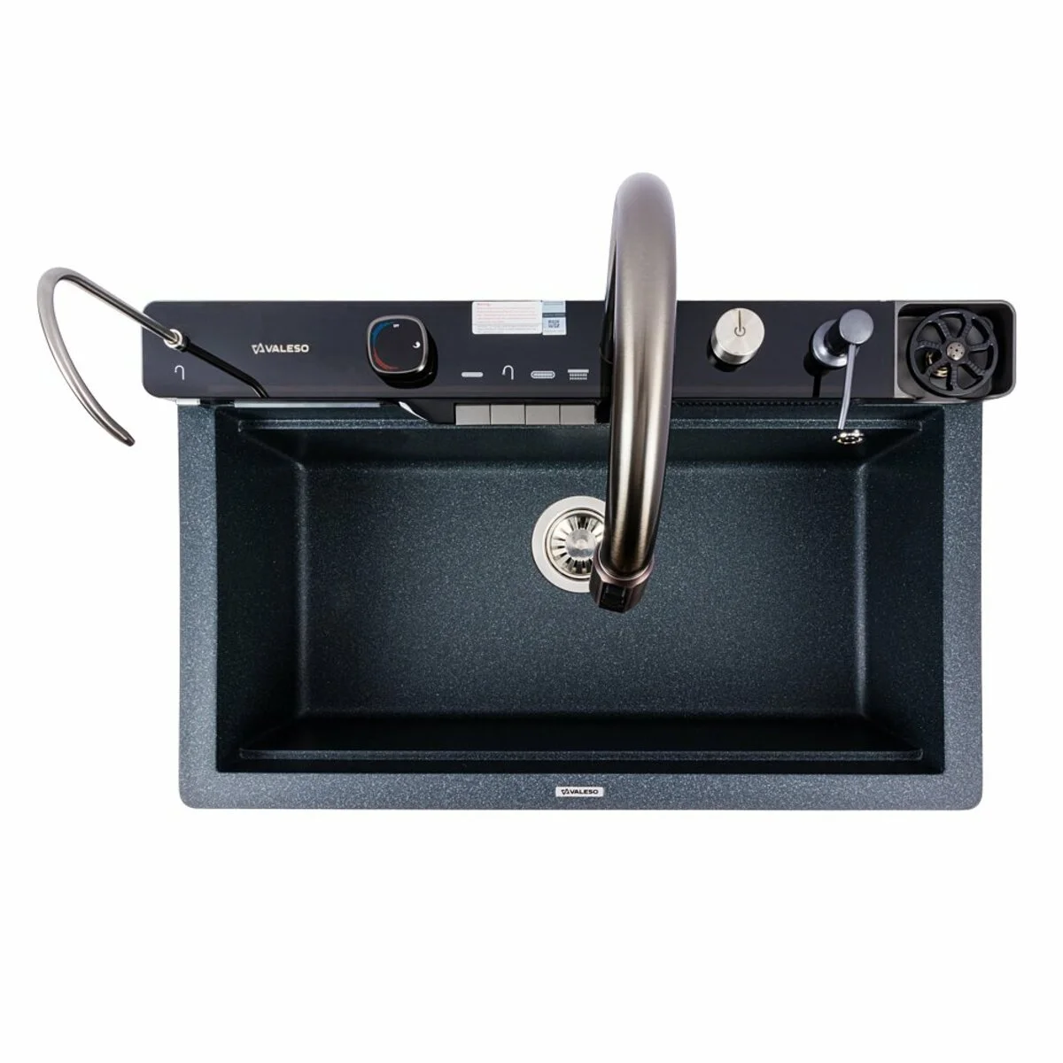 Гранітна мийка VALESO 7546 EVANORA у кольорі антрацит — це не просто мийка, а повноцінна інтегрована кухонна робоча станція, що втілює розкіш, інновації та функціональність. Її матова поверхня та глибокий антрацитовий відтінок підкреслюють сучасний, преміальний дизайн.