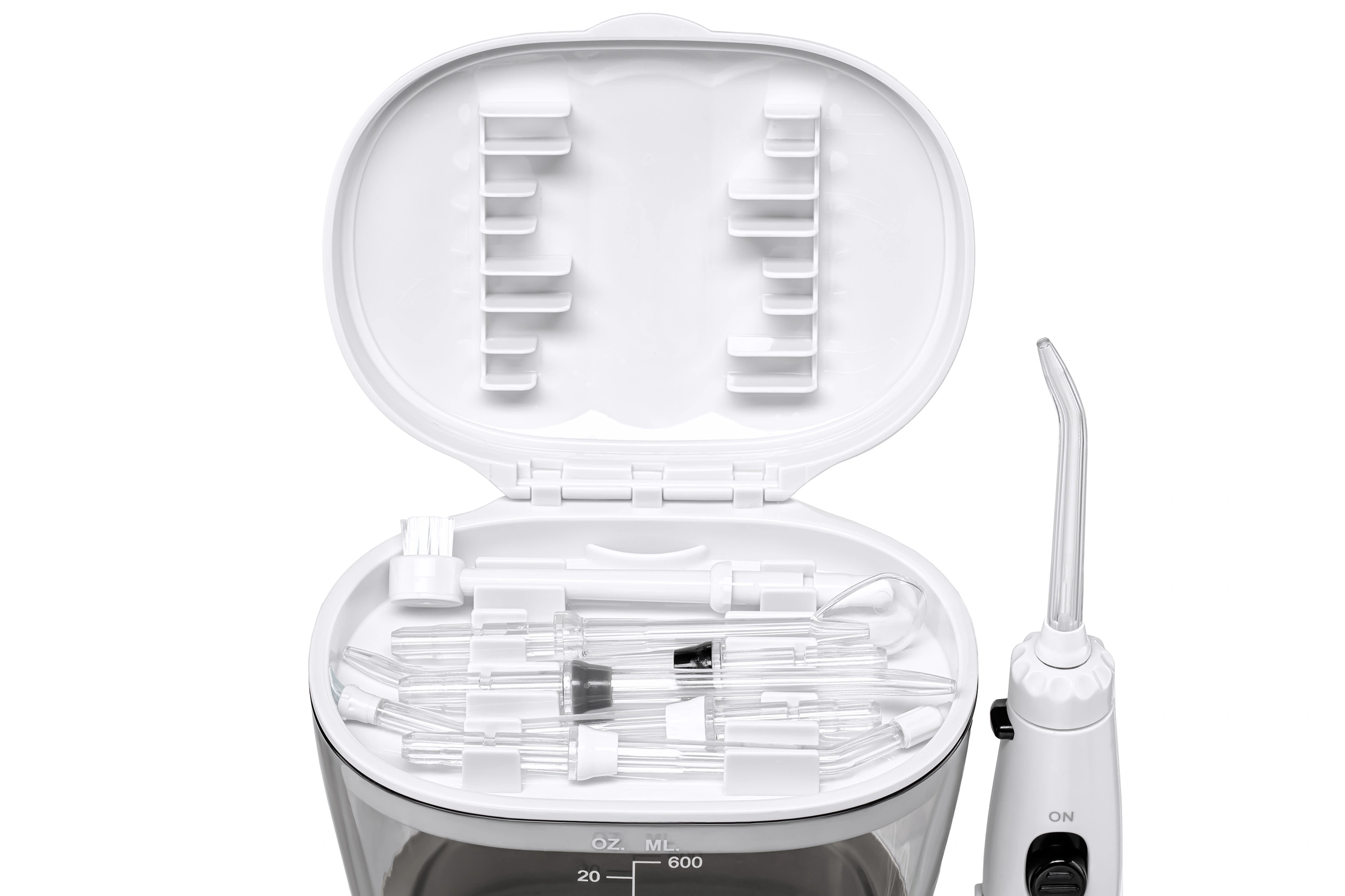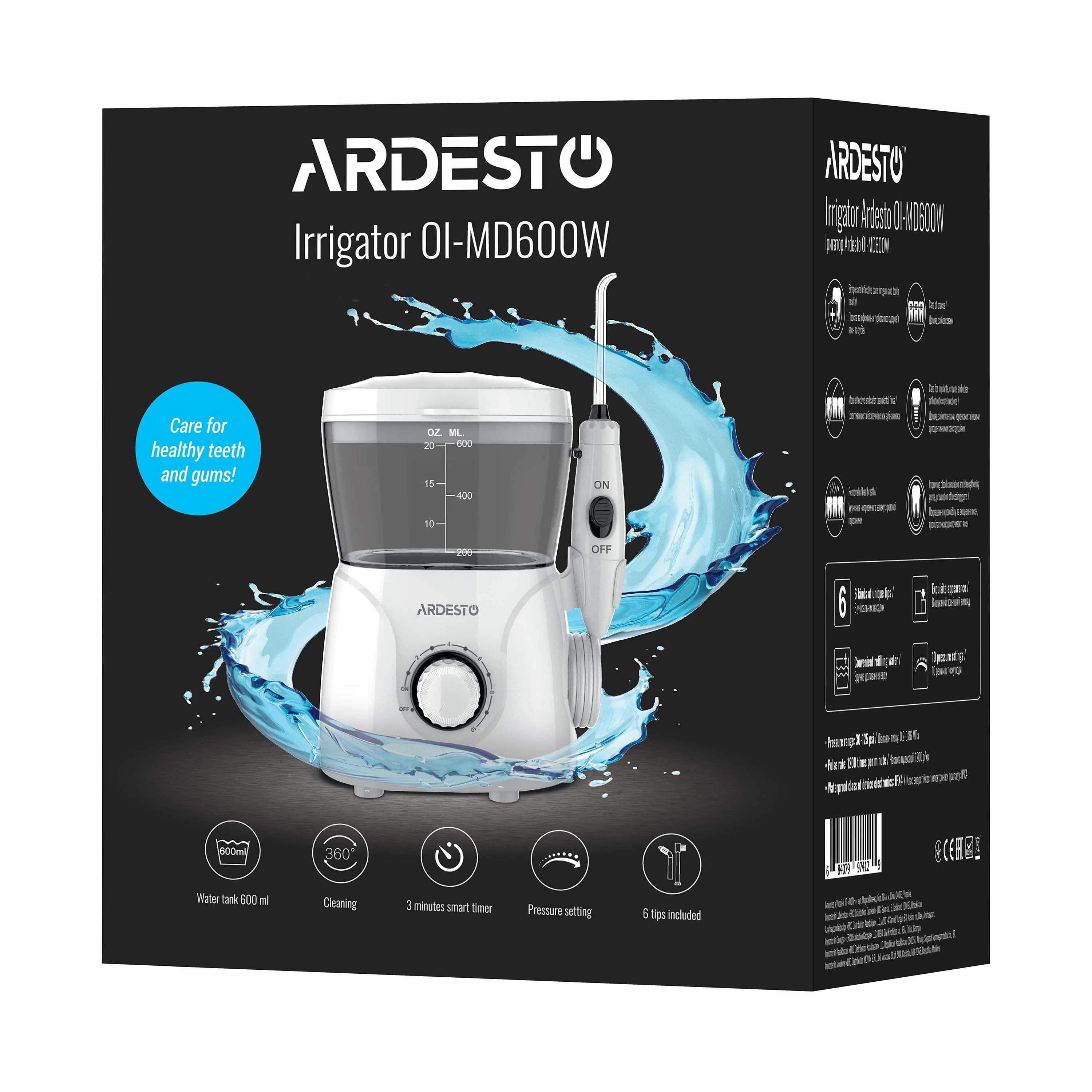 Стаціонарний іригатор з десятьма режимами тиску, великою кількістю насадок, ємністю для води на 600 мл, а також таймером на три хвилини. Очищає до 99,9% залишків їжі, навіть в важкодоступних місцях, куди не може потрапити класична щітка.