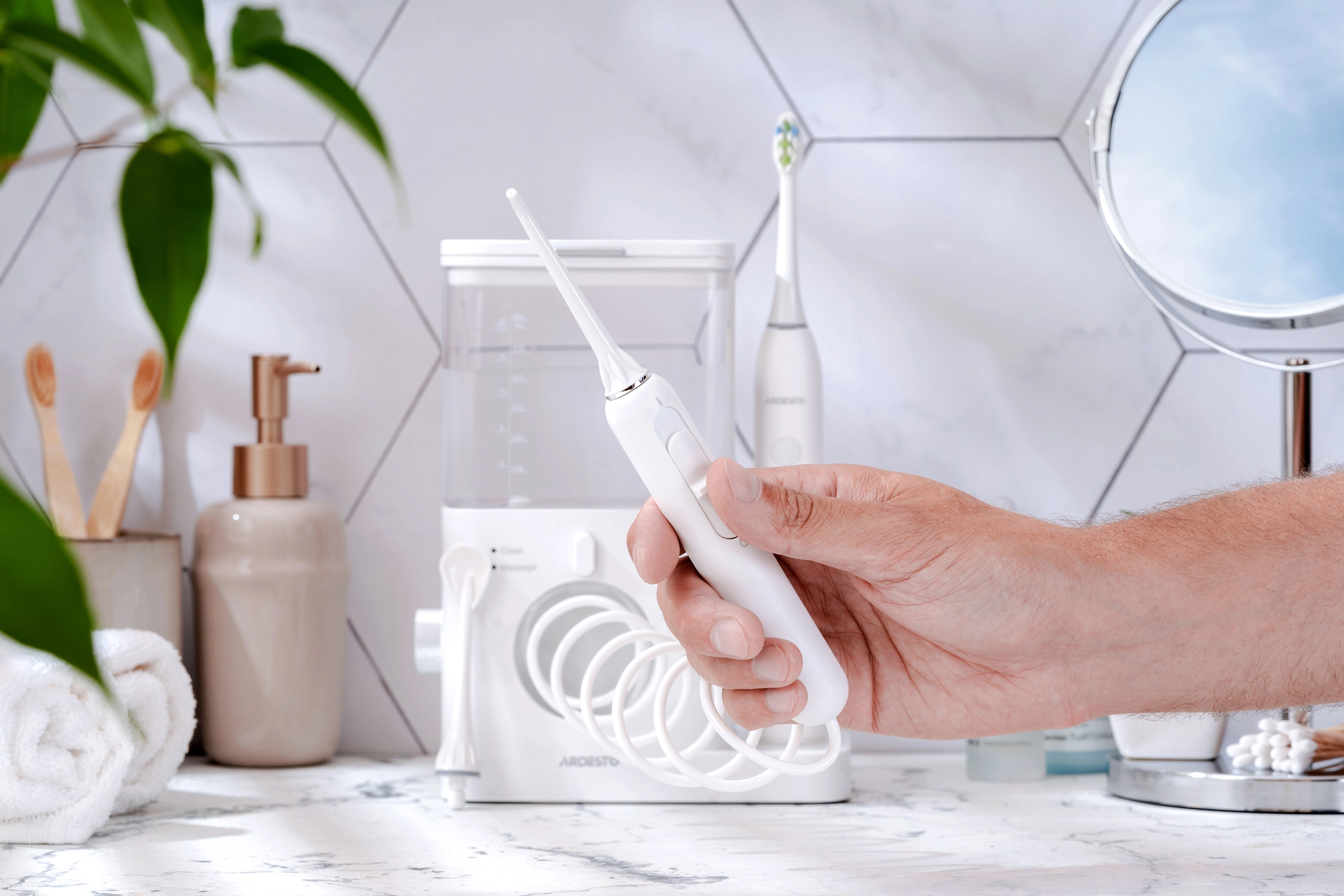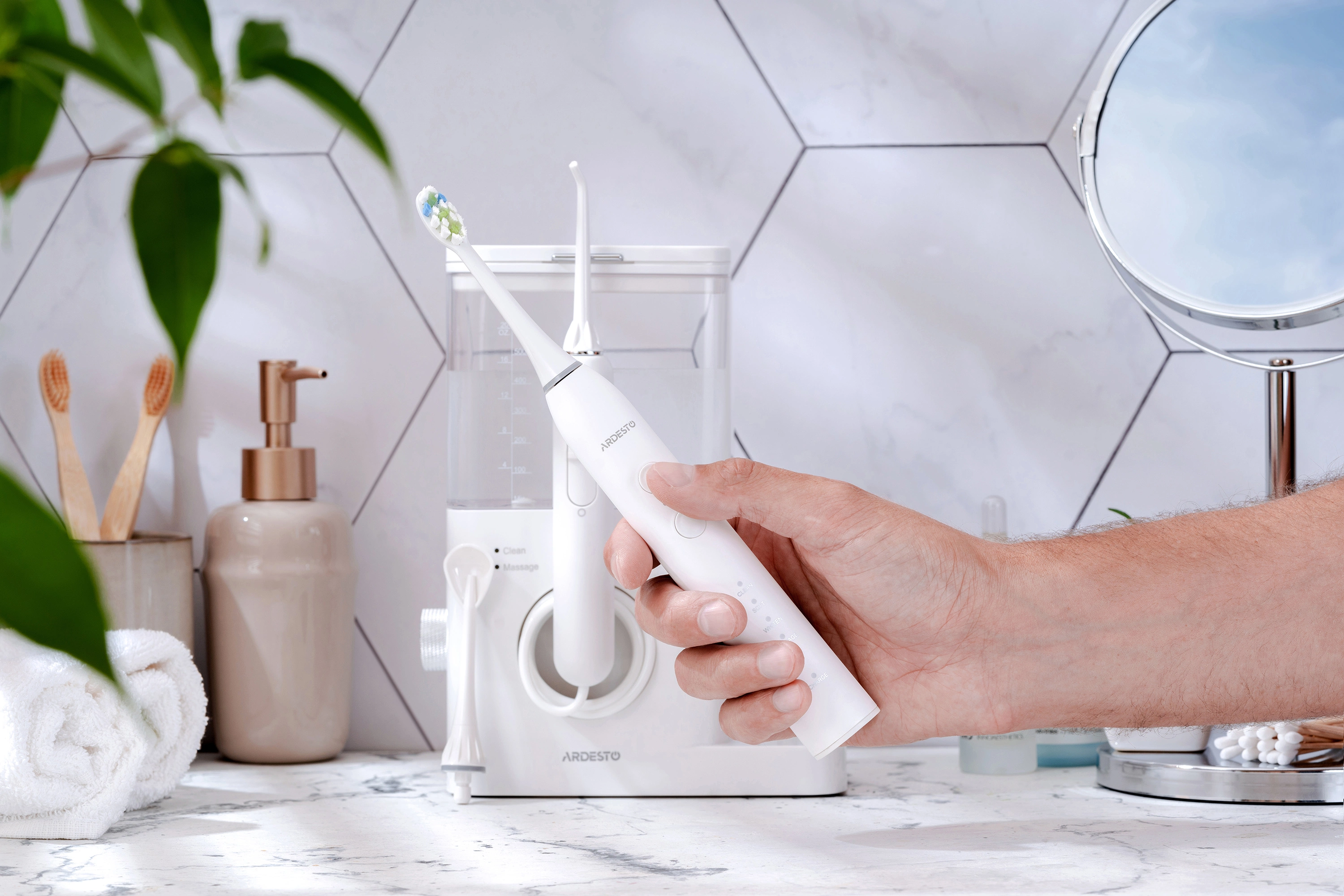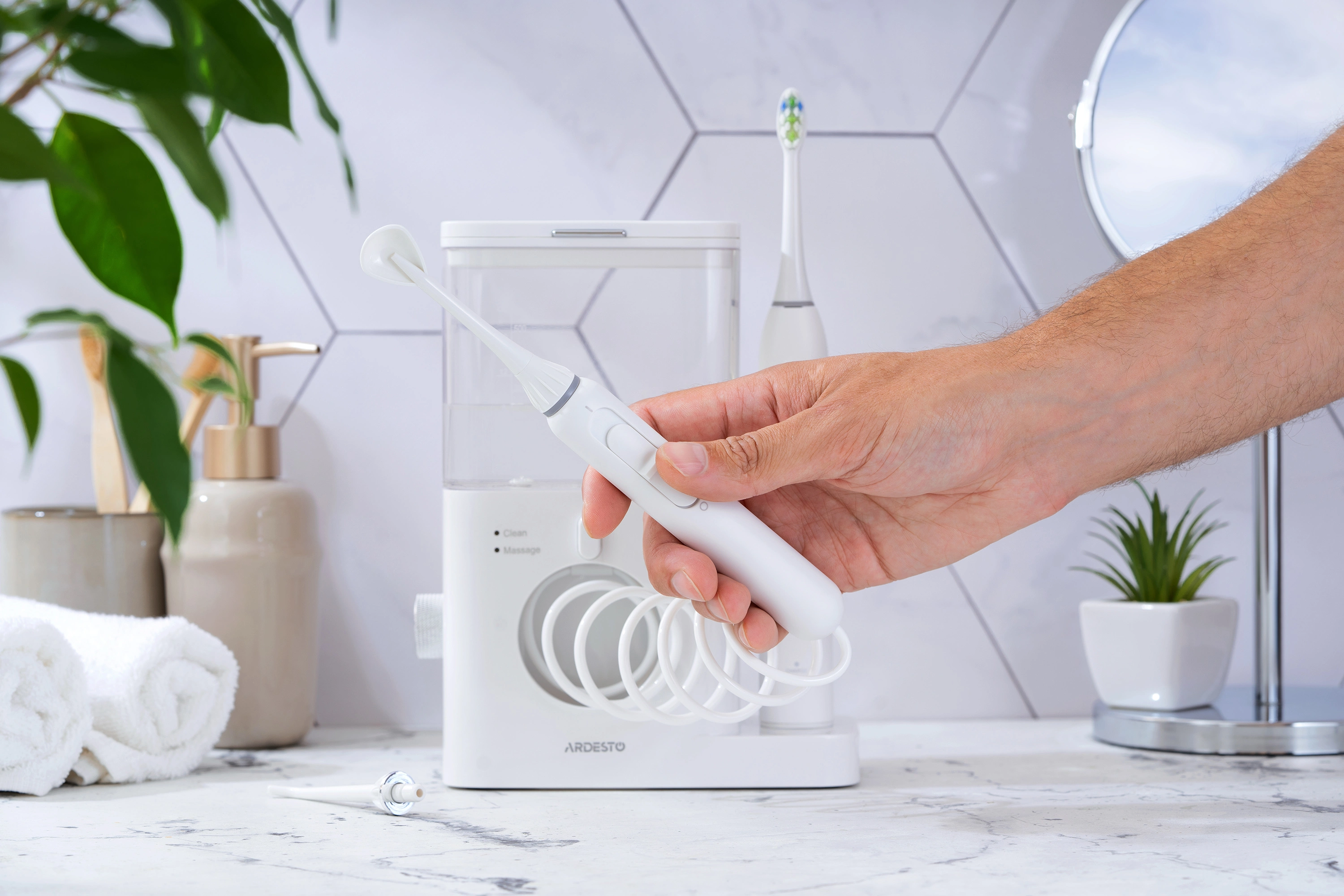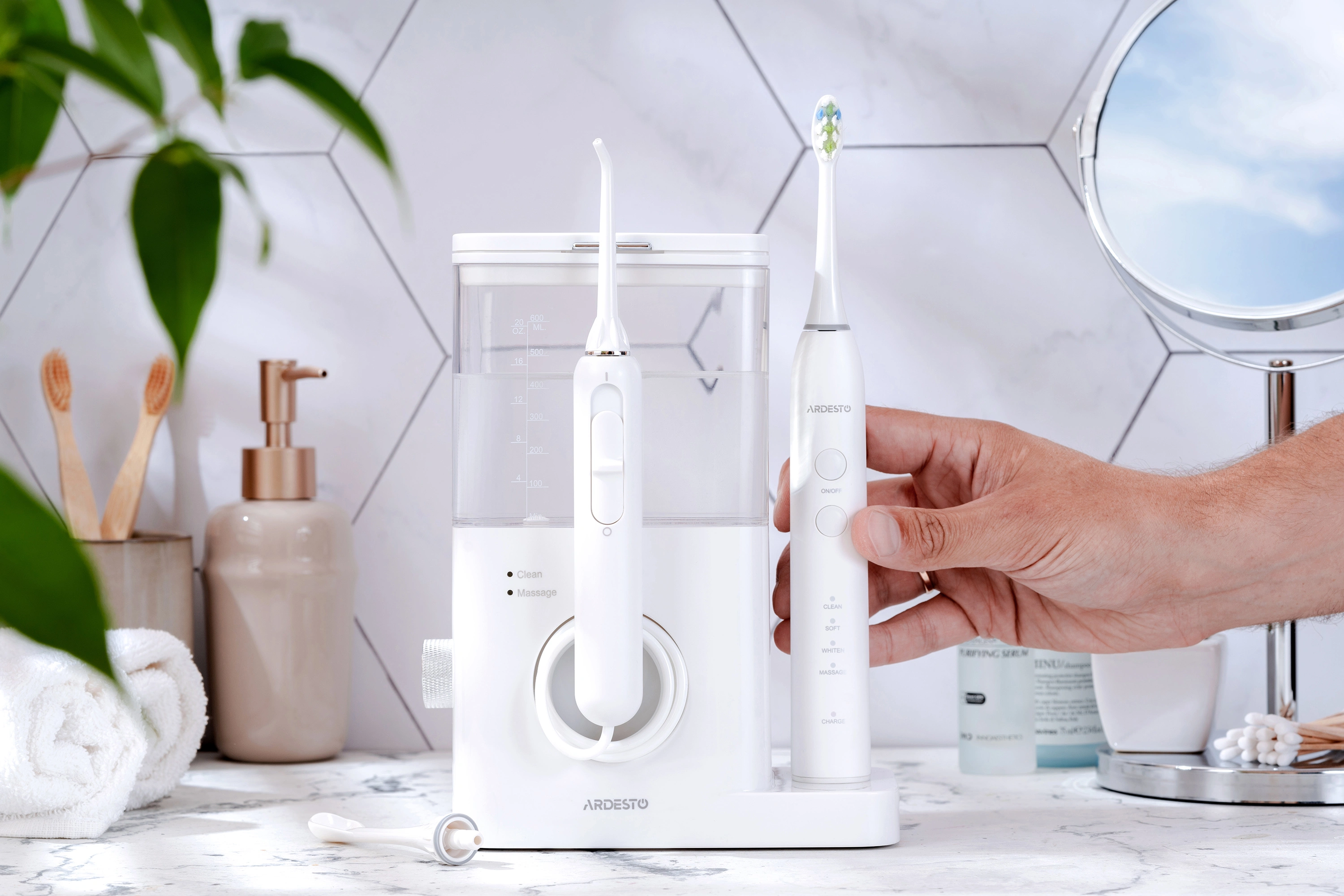Іригатор Ardesto стаціонарний+електрична зубна щітка, чаша 600 мл, від мережі , 3 насадки, білий