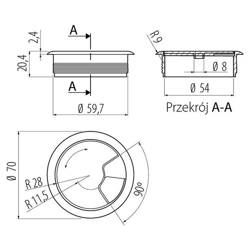 Кабельный пропуск предназначен для декорирования отверстия в поверхности мебели для вывода кабелей и проводов оргтехники, в одном месте.