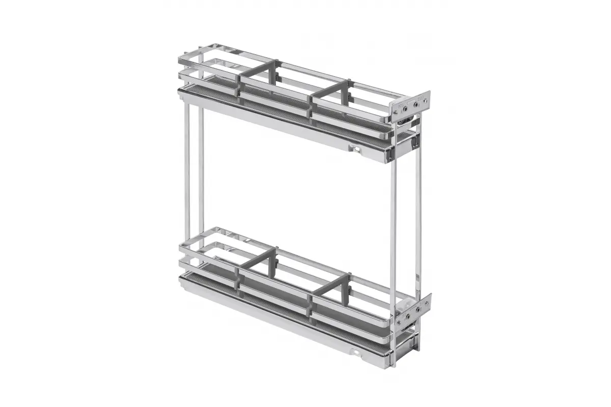 Карго MOVIX может быть установлен с одной стороны в зависимости от выбора направляющих, которые не входят в комплект, для левостороннего монтажа: PB-KO450BO-E-L и для правого монтажа: PB-KO450BO-E-R. Крепления к стенкам кузова и к передней части шкафа обеспечивают устойчивость конструкции, а регулировка в трех плоскостях облегчает процесс сборки. Ширина грузовых корзин составляет 150 мм, что позволяет хранить бутылки с маслами, соками или уксусом. Цвет системы - хромированный, а круглые перила придают ей эстетичный вид.