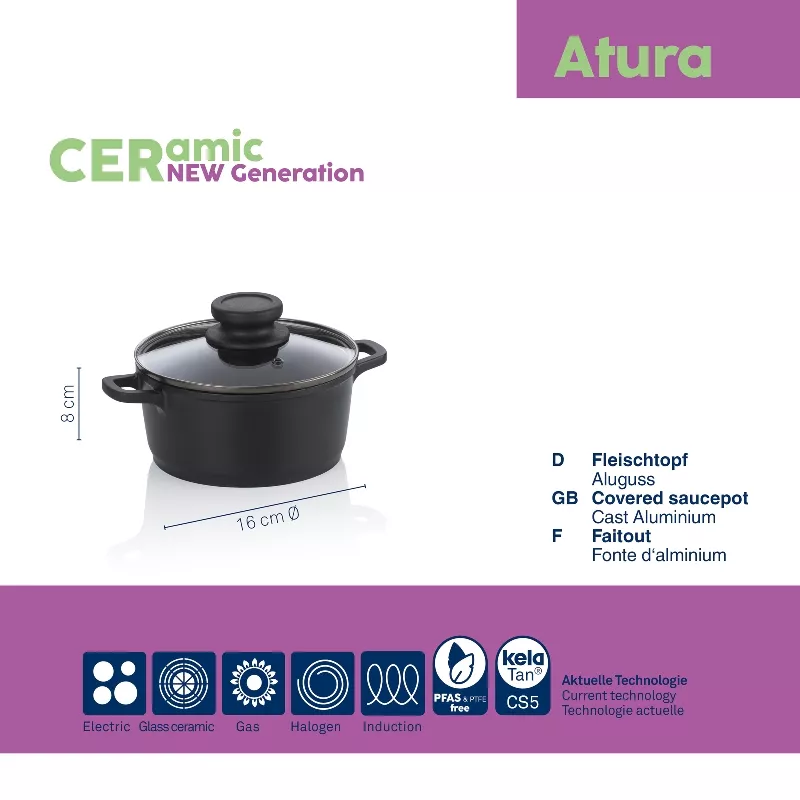 Керамічне покриття каструлі KELA Atura нового покоління без ПФАС (PFAS), термостійкість виробу до 250°C.