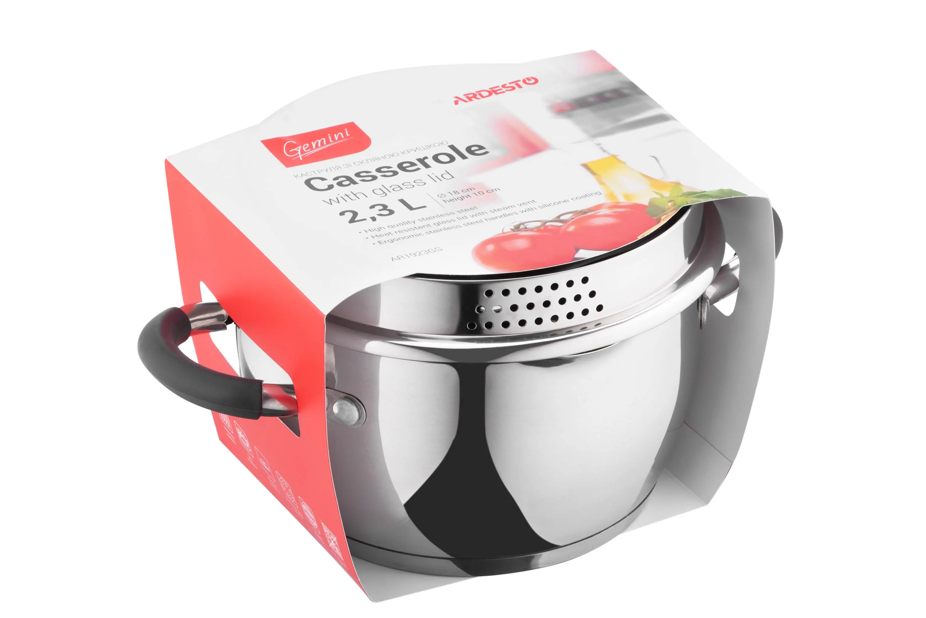 Каструля зі скляною кришкою та зливом Ardesto Gemini Livorno, 2.3л, нержавіюча сталь, силікон