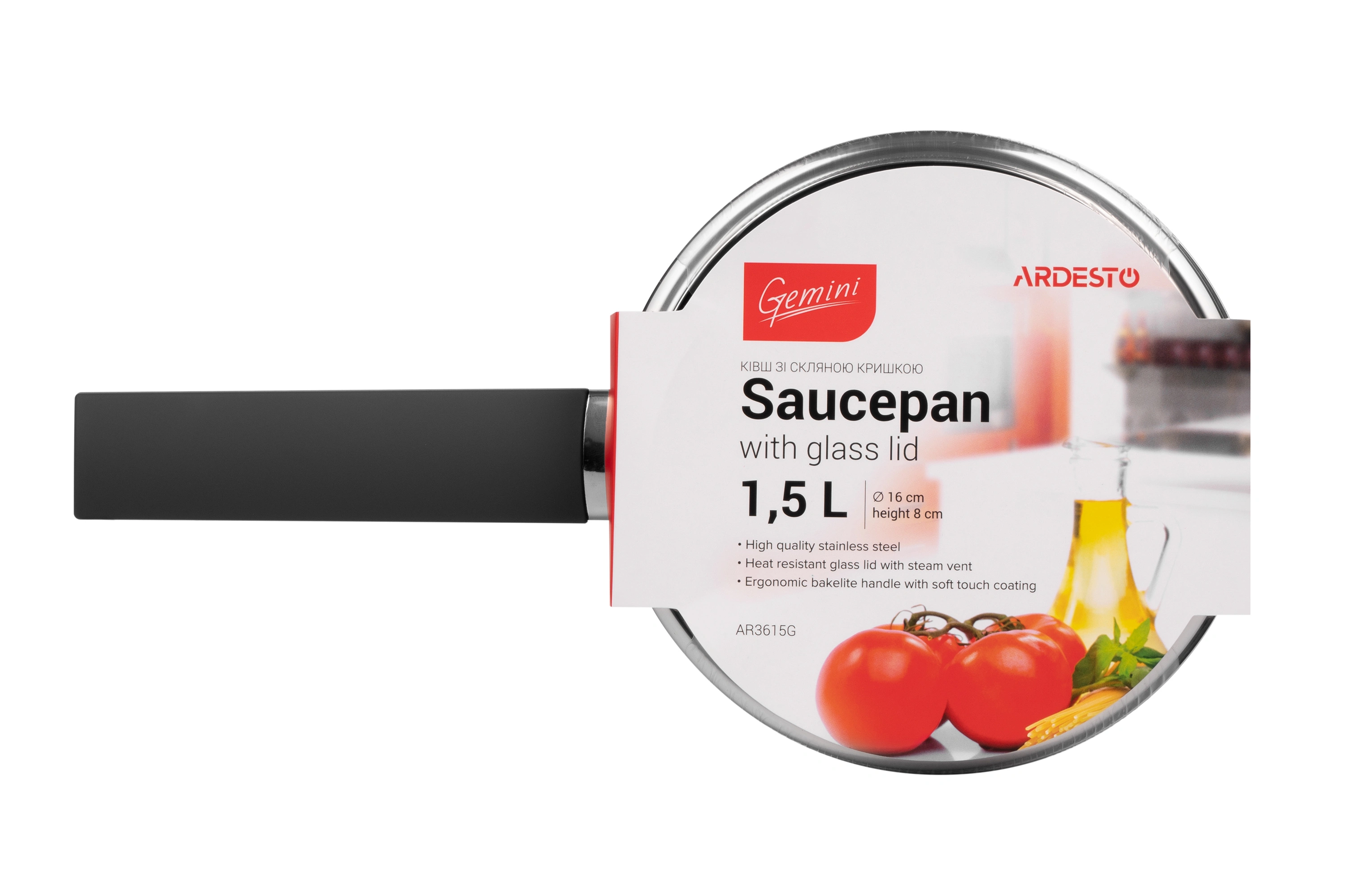 Ківш зі скляною кришкою Ardesto Gemini Trento, 1.5л, нержавіюча сталь, бакеліт