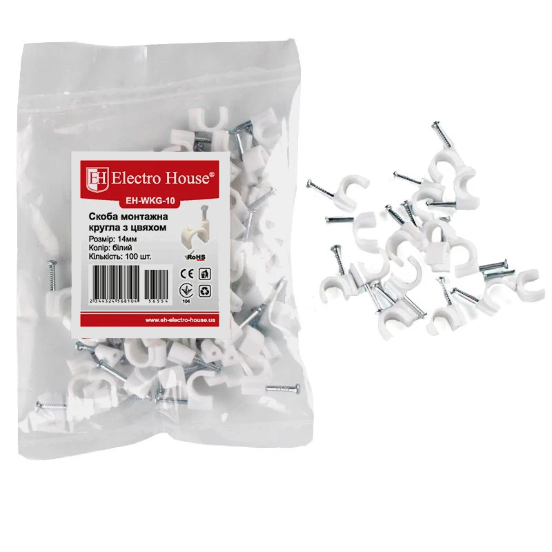 Клипса монтажная с гвоздем круглая 14 мм, 100 шт. EH-WKG-10 от ElectroSpace - эффективный элемент для монтажа электропроводов. Скоба идеально подходит для закрепления круглых проводов на различных поверхностях, таких как стены, потолки и другие прямые плоскости. Благодаря гвоздю, изготовленному из прочной стали, покрытой цинком, клипса надежно фиксируется и обеспечивает стабильное удержание проводов. Пластиковое полукольцо, в которое вкладывается кабель, изготовлено из негорючего материала, что гарантирует дополнительную безопасность в процессе эксплуатации.
