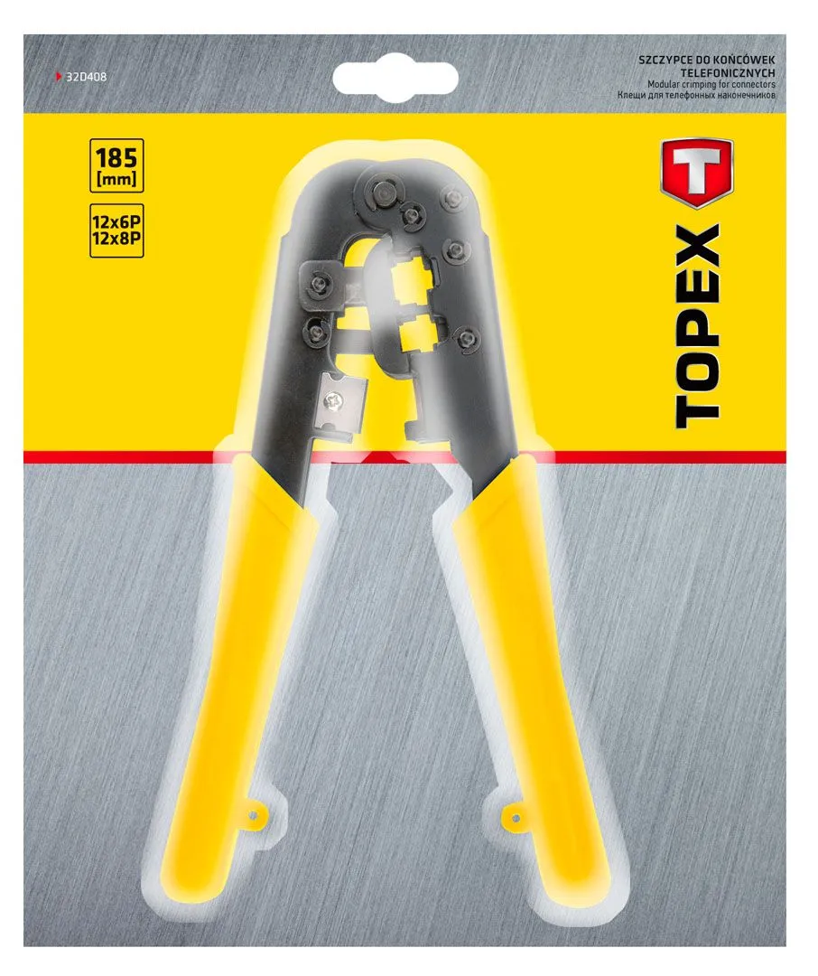 Кліщі для обтиску телефонних наконечників TOPEX довжиною 185 мм. Ергономічна ручка з пластику зручно міститься в долоні, що підвищує комфорт праці. У наборі 12 наконечників 6P і 12 наконечників 8P. Марка TOPEX адресована майстрам, які займаються дрібним ремонтом.
