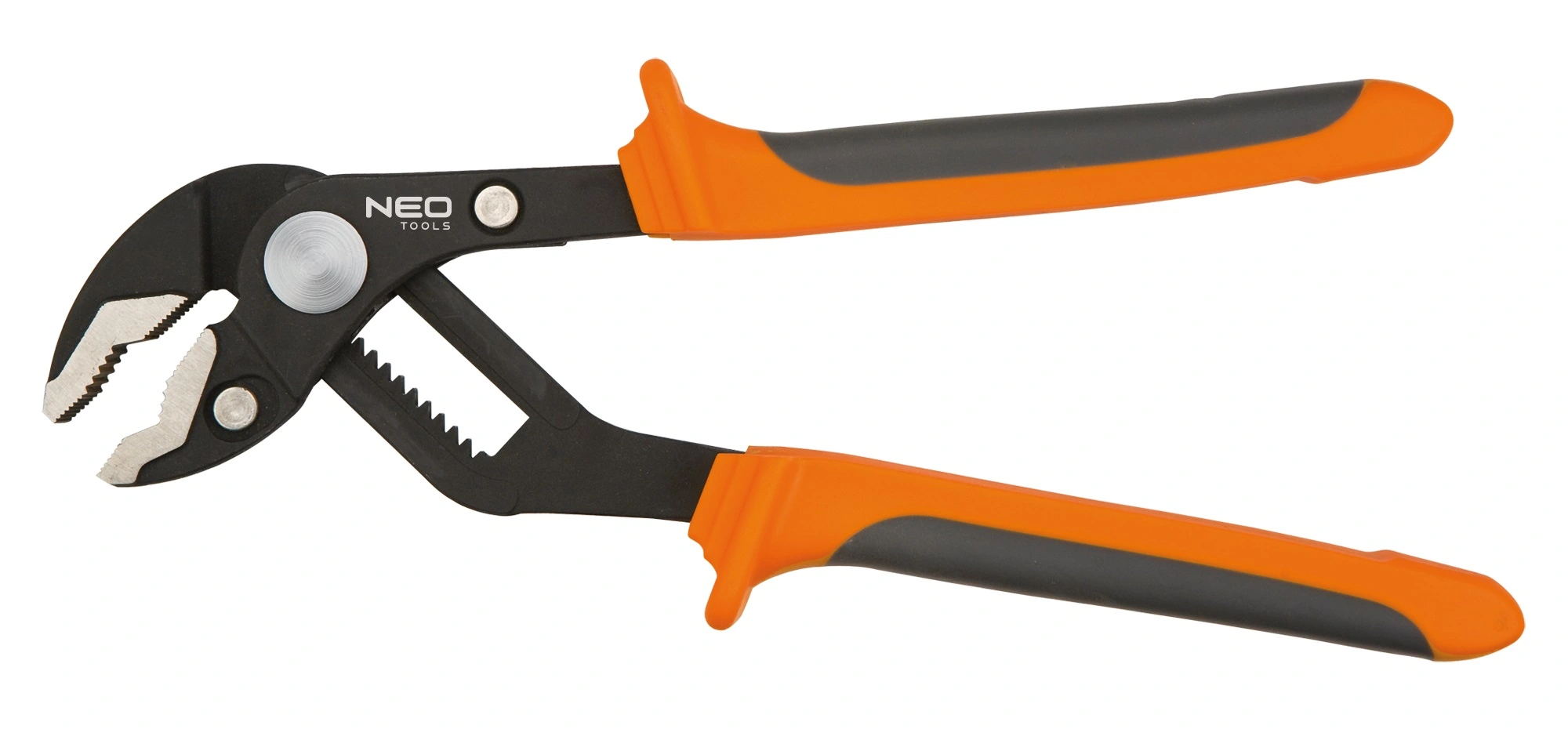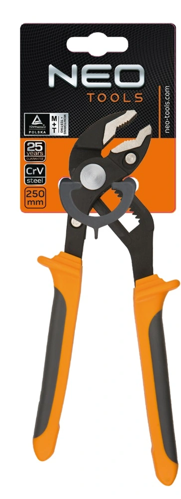 Кліщі сантехнічні NEO, розмір 250 мм, робочий діапазон губок 0-42 мм, з переставним зубчастим шарнірним механізмом. Виконання відповідно до стандарту DIN 8976. Високосортна хромованадієва сталь гарантує довголітню міцність кліщів. Двокомпонентні, ергономічні рукоятки підвищують комфорт експлуатації.