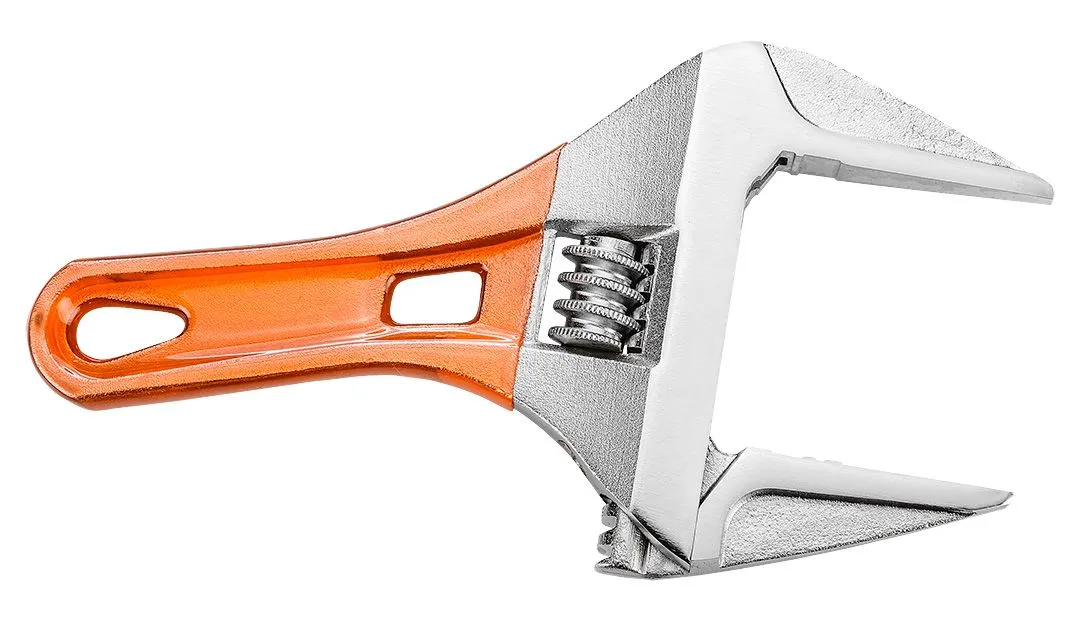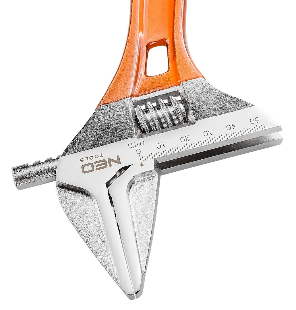 Розвідний ключ NEO довжиною 185 мм і діапазоном 0-53 мм викуваний з міцної хром-ванадієвої сталі. Відрізняється подовженими, профільованими губками з дуже широким діапазоном регулювання і малою товщиною головки ключа, що полегшує роботу у важкодоступних місцях.