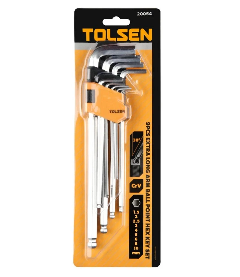 Комплект з 9-ти подовжених шестигранних закруглених ключів Tolsen різного розміру призначений для закручування/відкручування кріпильних елементів (гвинтів, гайок, шурупів) з внутрішнім шестигранником в перетині. Підходить для майстрів будь-якої галузі.