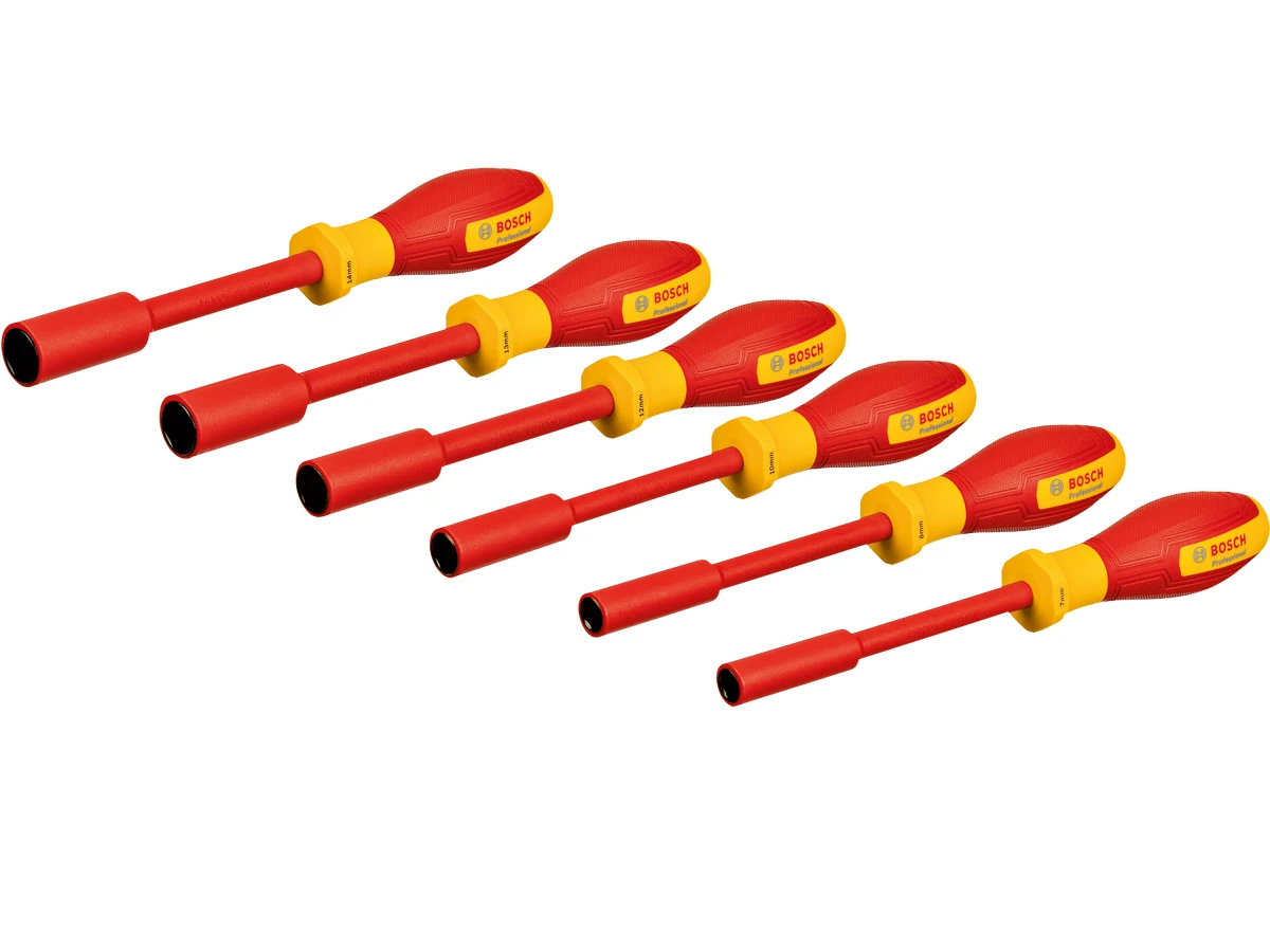 Набір торцевих VDE-ключів Bosch Professional (6 шт) із зовнішнім шестигранним профілем забезпечує безпечну роботу під напругою до 1000 В. Ізоляція TPE, стрижень із хромованої сталі S2, ергономічне руків’я та захист від прокручування — все для точного, комфортного й надійного монтажу. Розміри: 7–14 мм, довжина кожного — 125 мм. Постачається у вставці L-Boxx.
