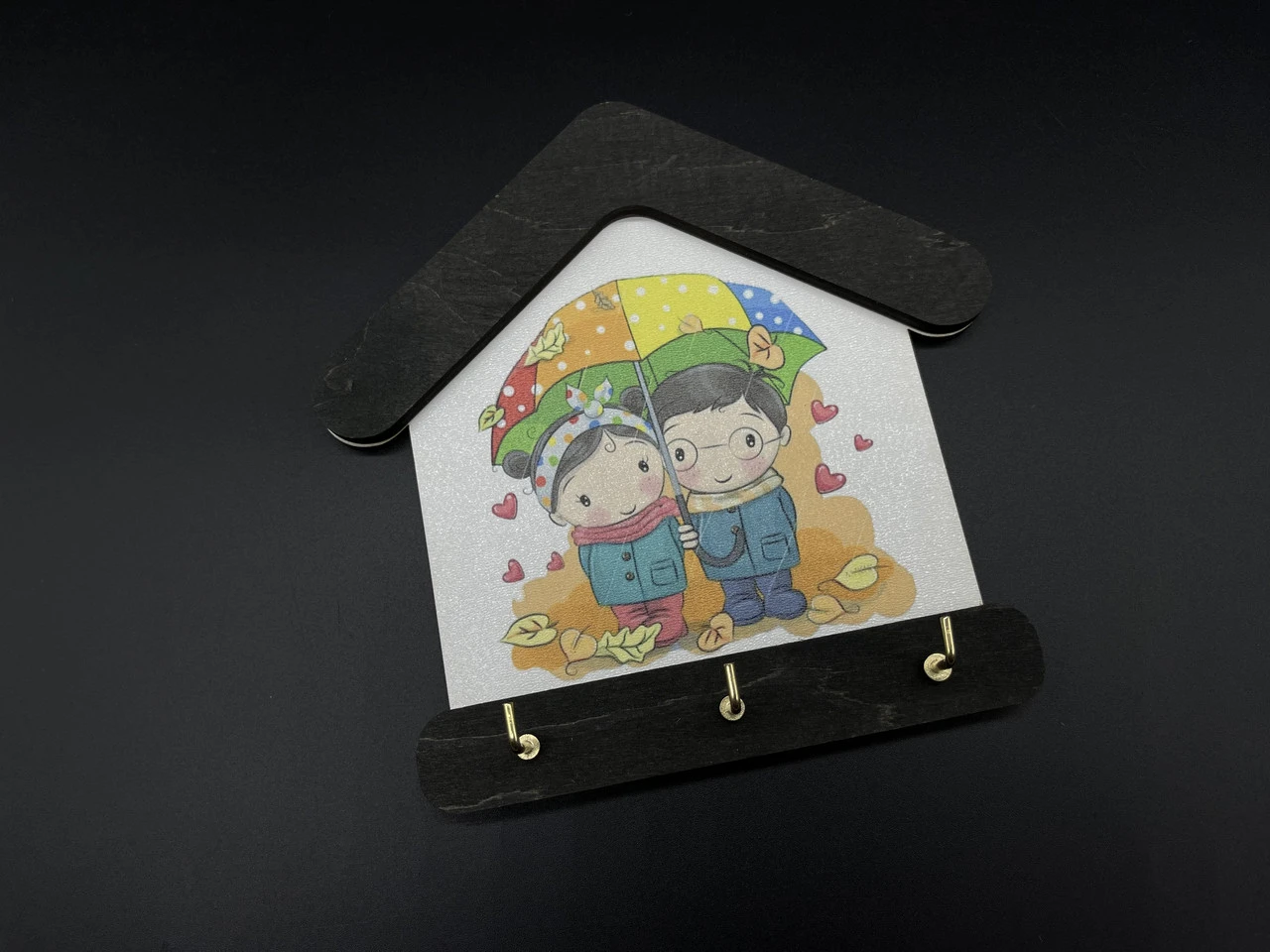 Ключница настенная деревянная, 18х18см, «Дети с зонтиком», в форме дома 3 крючка