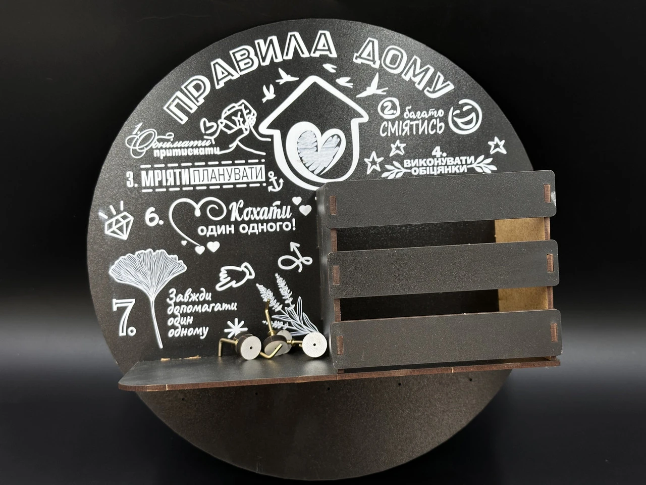 Ключница настенная деревянная с УФ-печатью, 12х10х10см, «Правила дома», Цвет «черный», с корзиной, 5 крючков