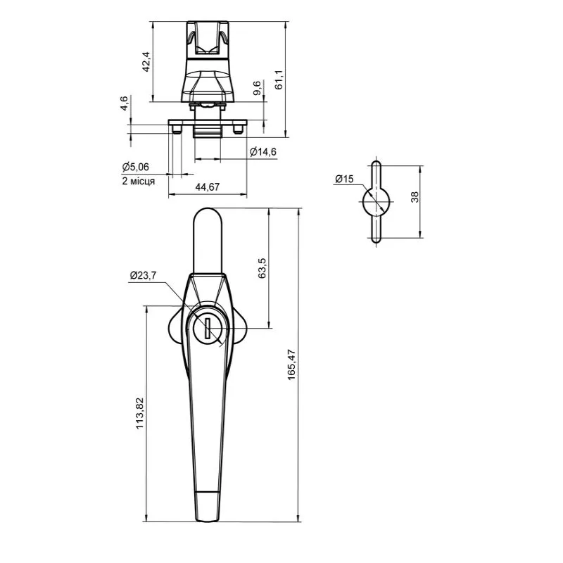Комплект: замок с ручкой L-образной, ригель с крепежом, 2 ключа из металла.