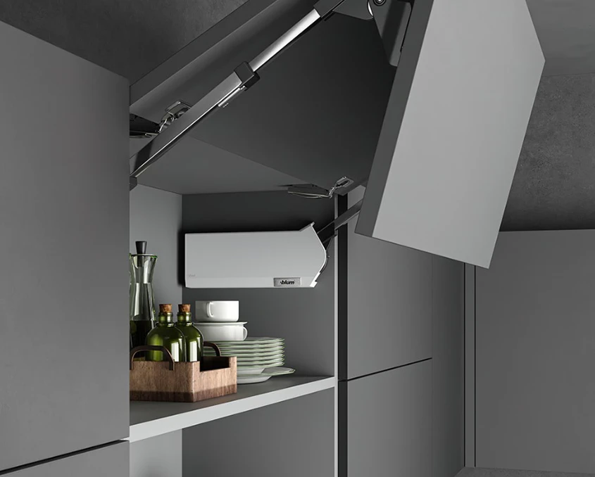 Aventos HF подходит для фасадов разного стиля - из древесины, стекла или их комбинаций. Механизм не нарушает внешнего вида мебели, ведь система крепится скрыто, сохраняя эстетику интерьера. Также предусмотрена интеграция с электрической системой Servo-Drive, которая обеспечивает автоматическое открывание дверцы легким нажатием - идеальное решение для современных кухонь, где функциональность сочетается с комфортом.