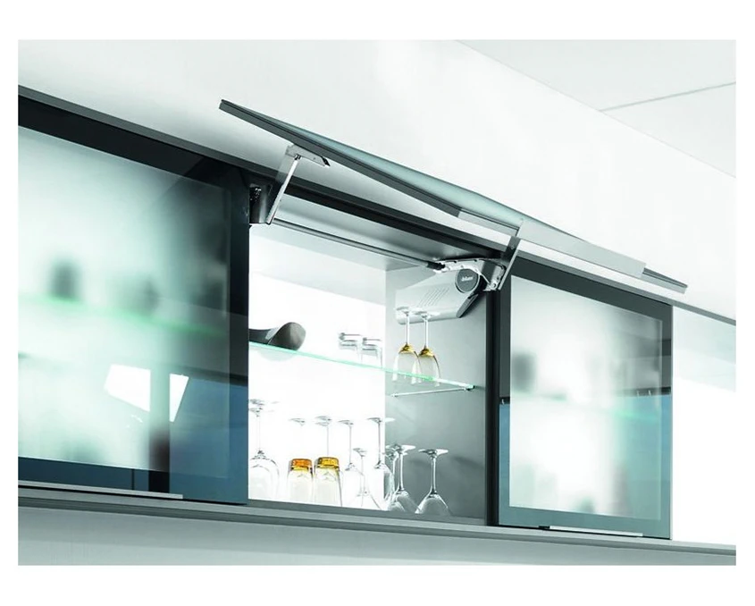 Aventos HS от Blum - подъемный механизм, идеальный для больших и тяжелых фасадов, которые поднимаются и плавно наклоняются над корпусом шкафа. Подходит для широких верхних шкафов, предоставляя удобный доступ к их содержимому без необходимости открывать дверцу в сторону.