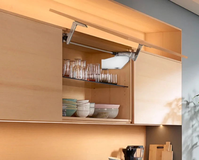Aventos HS от Blum - подъемный механизм, идеальный для больших и тяжелых фасадов, которые поднимаются и плавно наклоняются над корпусом шкафа. Подходит для широких верхних шкафов, предоставляя удобный доступ к их содержимому без необходимости открывать дверцу в сторону.