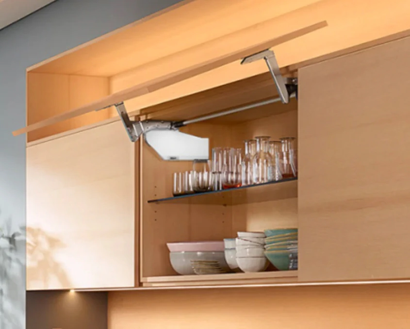 Aventos HS от Blum - подъемный механизм, идеальный для больших и тяжелых фасадов, которые поднимаются и плавно наклоняются над корпусом шкафа. Подходит для широких верхних шкафов, предоставляя удобный доступ к их содержимому без необходимости открывать дверцу в сторону.