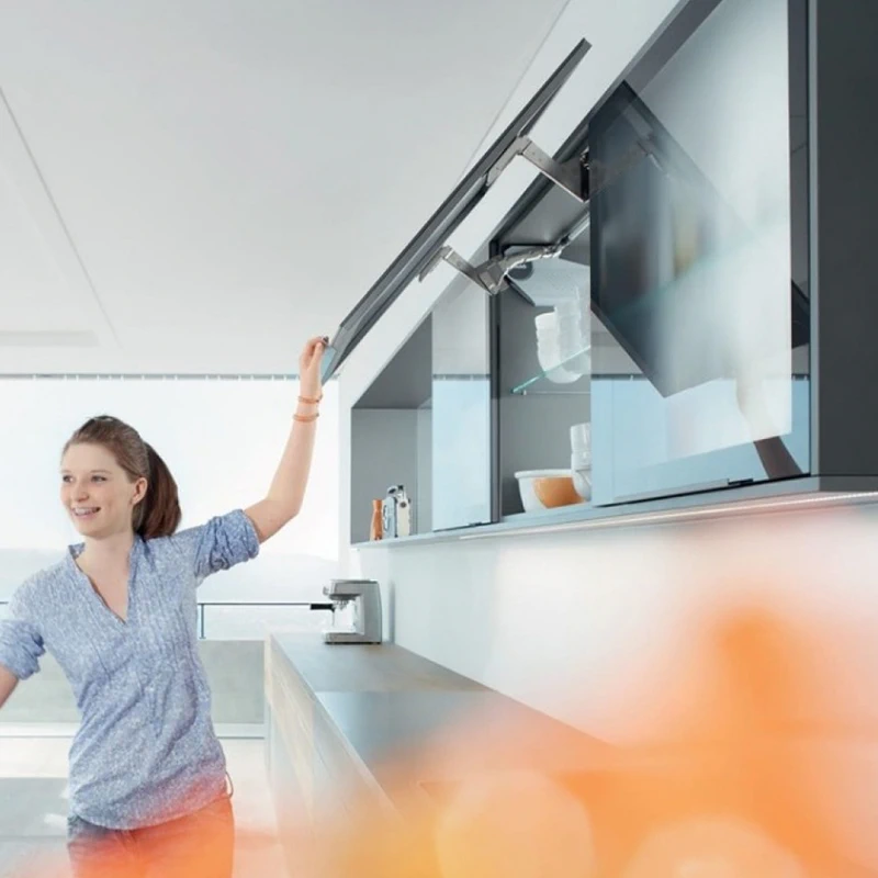 Aventos HS от Blum - подъемный механизм, идеальный для больших и тяжелых фасадов, которые поднимаются и плавно наклоняются над корпусом шкафа. Подходит для широких верхних шкафов, предоставляя удобный доступ к их содержимому без необходимости открывать дверцу в сторону.