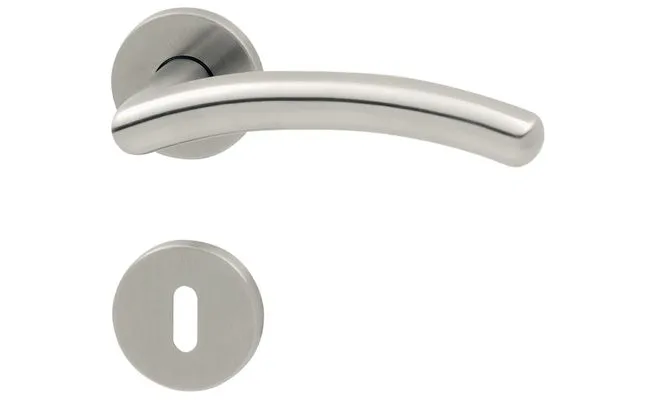 Комплект важільних ручок, виготовлених з нержавіючої сталі. Застосовуються для дерев’яних дверей під ключ з борідкою. Чудово підійдуть до дизайну сучасних інтер’єрів та слугуватимуть довго та надійно завдяки якості та надійності використаних матеріалів.