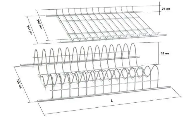 Комплект Häfele 544.20.877 предназначен для установки в кухонные шкафы шириной 900 мм. В состав входят две решётки с антикоррозийным покрытием цвета металлик — для тарелок и чашек, серые крепления и прочный поддон из нержавеющей стали. Благодаря увеличенной ширине, комплект подходит для размещения большого количества посуды, обеспечивая удобство и порядок на кухне.