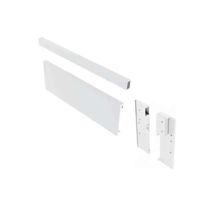 Комплект состоит из передней металлической панели, двух боковых рейлингов и креплений. Белый цвет делает его универсальным решением для светлой мебели в кухне, гардеробе, офисе или ванной комнате.