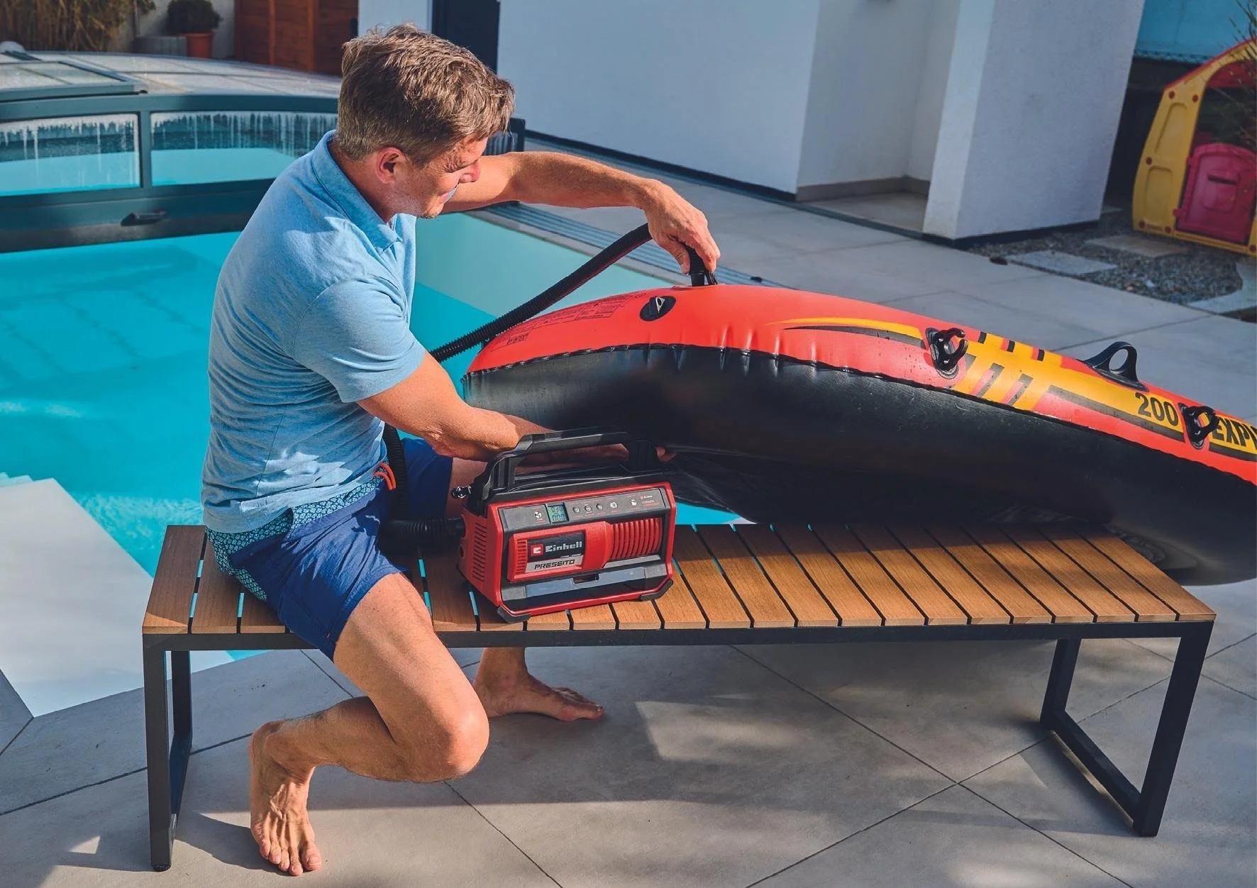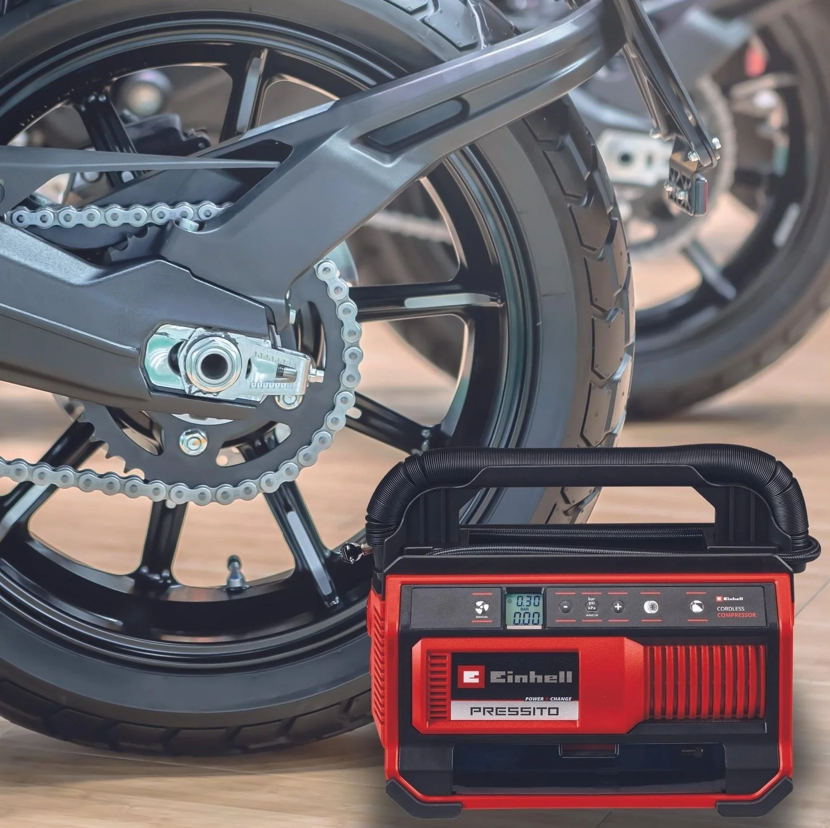 Акумуляторний компресор Einhell PRESSITO 18/25 серії Expert є частиною сімейства Power X-Change і живиться від акумулятора 18 вольт. У компресорі є насос високого тиску для шин автомобілів, мотоциклів, велосипедів та м'ячів, а також насос низького тиску для накачування надувних матраців, кругів та гумових човнів з функцією всмоктування низького тиску для надувних матраців і гумових човнів (3 в 1-функцій). Насос оснащений дворядковим дисплеєм тиску для зчитування заданого та фактичного тиску з регульованими налаштуваннями тиску до 11 бар і функцією автоматичного відключення при досягненні заданого тиску.