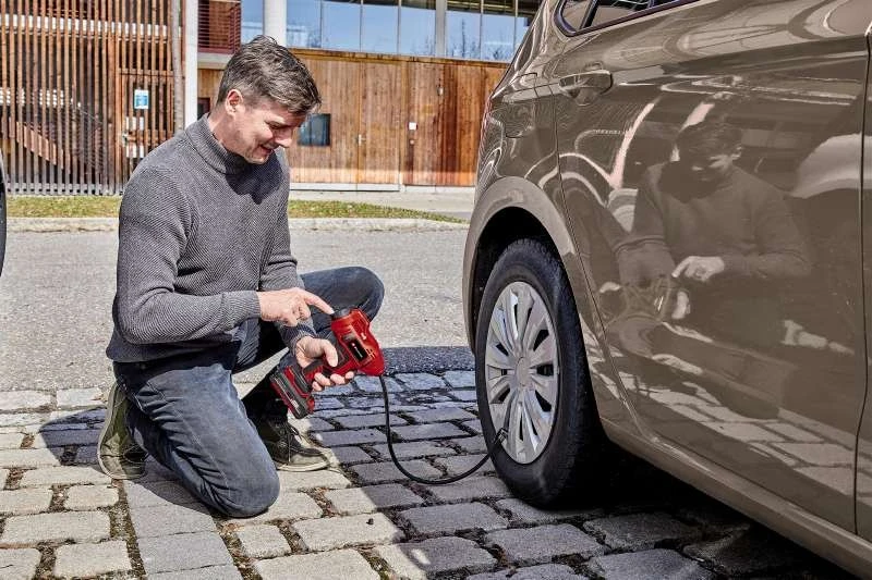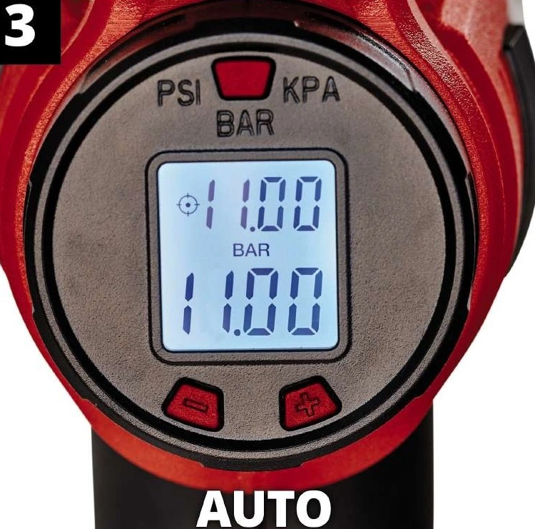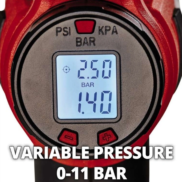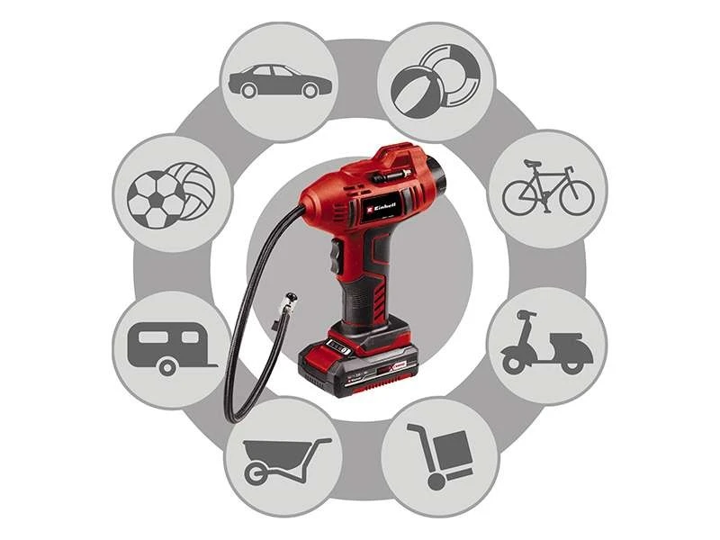 Акумуляторний автомобільний компресор Einhell CE-CC 18 Li-Solo серії car Expert є членом сімейства Power X-Change та ідеально підходить для накачування автомобільних шин, велосипедних шин або м'ячів. Насос оснащений цифровим індикатором тиску з регульованими налаштуваннями тиску до 11 бар та функцією автоматичного відключення при досягненні заданого тиску. Ви можете вибрати між бар, psi та kpa одним натисканням кнопки. Ручне надувка можливе у будь-який час без попереднього вибору.