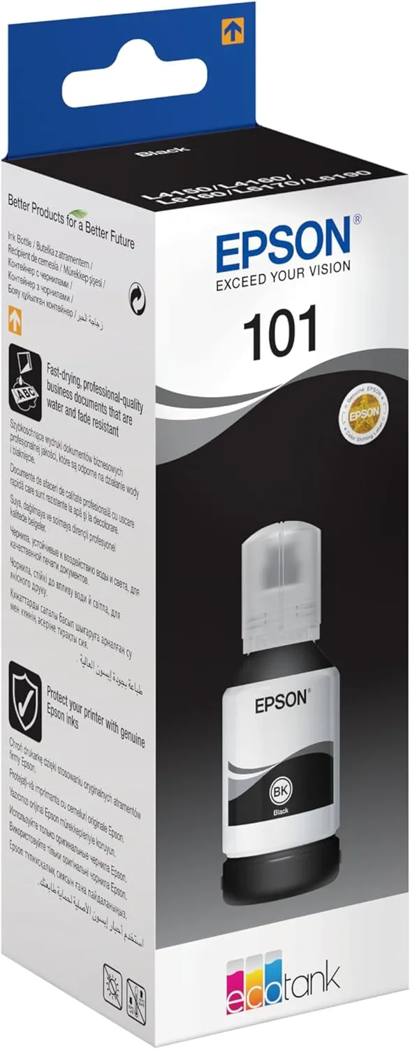 Контейнер Epson 101 L4150/L4160 black pigm це 127 мілілітрів якісних водорозчинних чорнил чорного кольору в міцній, зручній в експлуатації пластиковій ємності. Зручна заливка чорнила навіть в домашніх умовах.