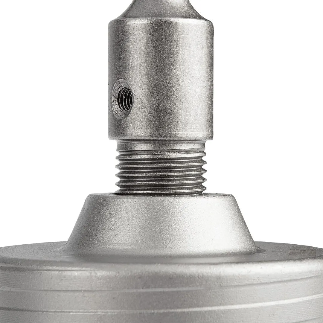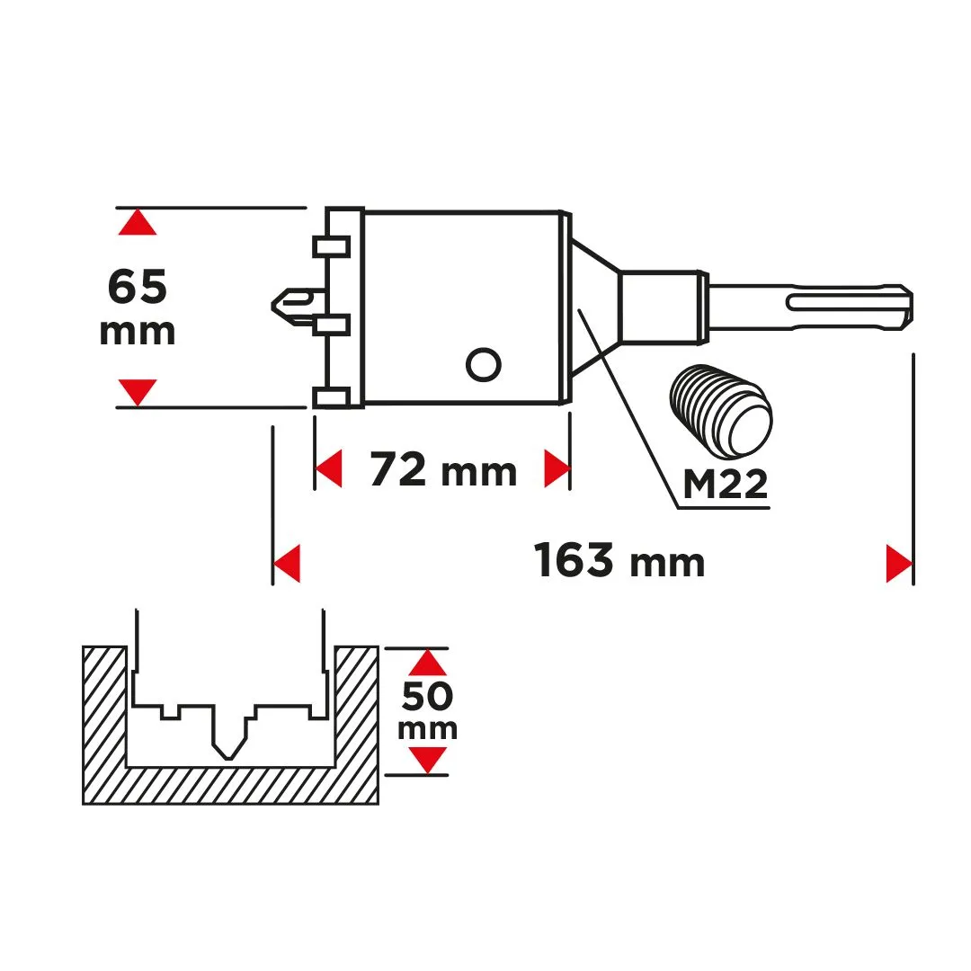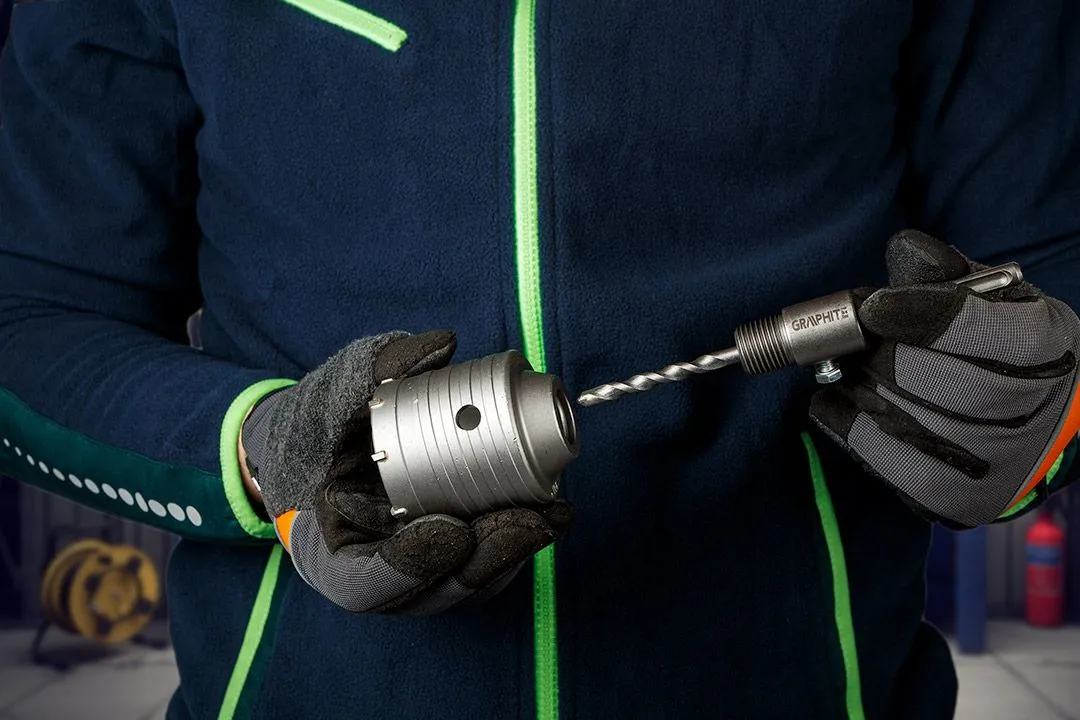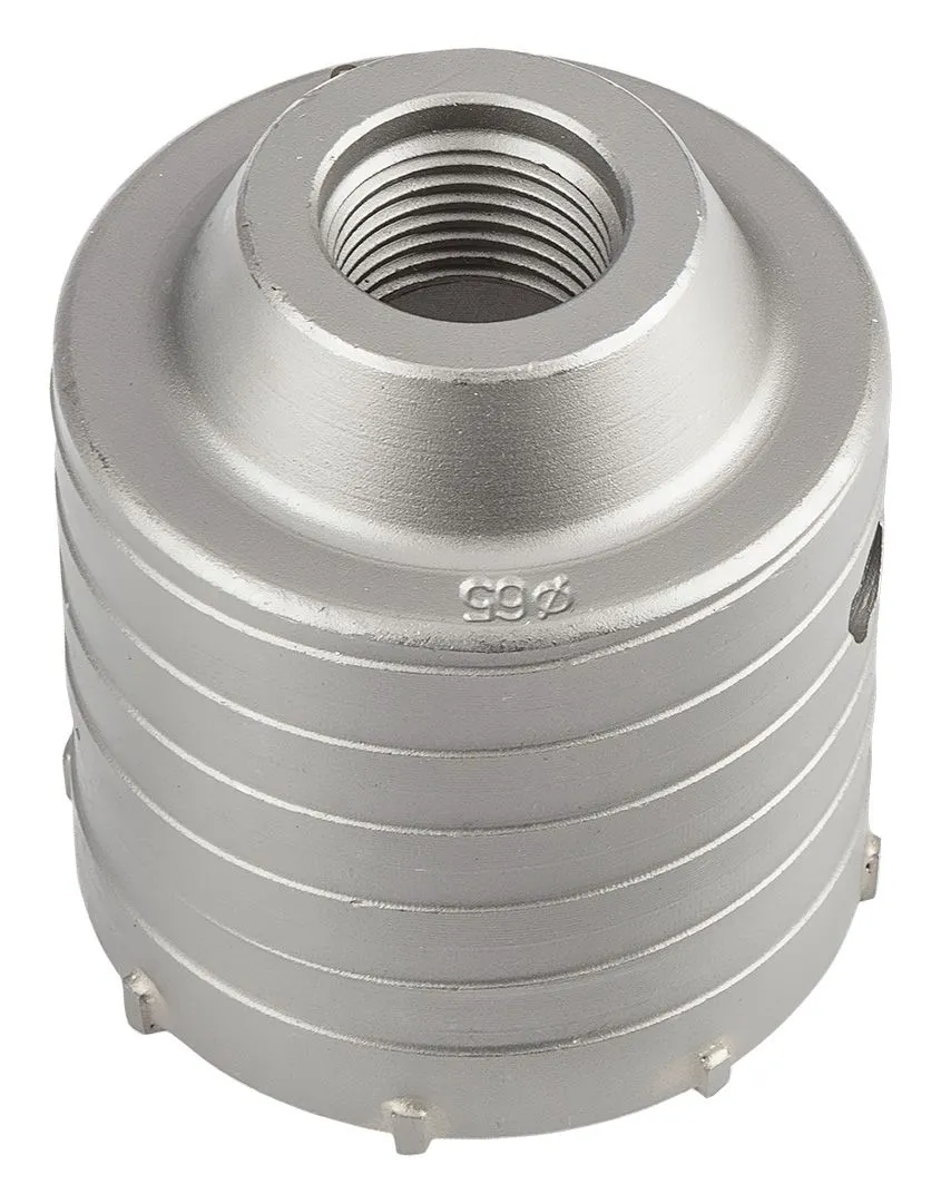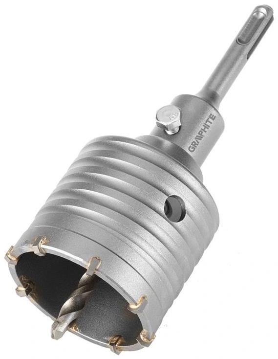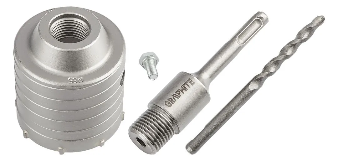 Коронка 65 мм з адаптером SDS+ та пілотним свердлом 55H321 від GRAPHITE характеризується діаметром пилки 65 мм, висотою 72 мм та глибиною свердління 50 мм. Вона оснащена 8 розширювачами завширшки 2,2 мм. Внутрішній діаметр становить 59 мм, а параметри свердла fi – 8 x 110 мм. Довжина всього набору складає 163 мм. Вона має можливість свердління молотком, а також призначена для свердління отворів у бетоні та цеглі. За її допомогою можна підготувати отвори під монтажні коробки. Дрібнозернисті твердосплавні леза з підвищеною зносостійкістю продовжують термін служби інструменту.