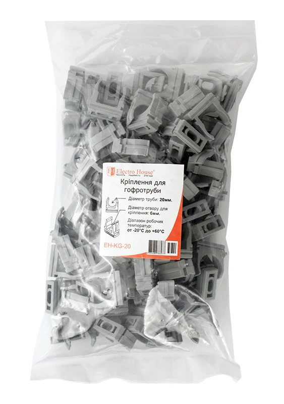 Крепление для гофротруба Ø20 мм, отверстие Ø6 мм, 100 шт. EH-KG-20 от ElectroSpace — идеальное решение для надежной фиксации гофрированных труб в электромонтаже. Этот U-образный крепеж с отверстиями Ø6 мм позволяет удобно и быстро устанавливать трубы на стены или потолки, обеспечивая стабильную фиксацию при минимальных усилиях. Благодаря продуманной конструкции, установка гофротруб является простой, а демонтаж не вызывает трудностей, что делает процесс монтажа максимально удобным и эффективным. Оно устойчиво к воздействию влаги, холода и механическим повреждениям. Прочные ребра жесткости в конструкции гарантируют стабильность крепления, предотвращая возможное повреждение при длительном использовании. Крепление надежно удерживает трубу, но при этом позволяет легко вытащить ее при необходимости.