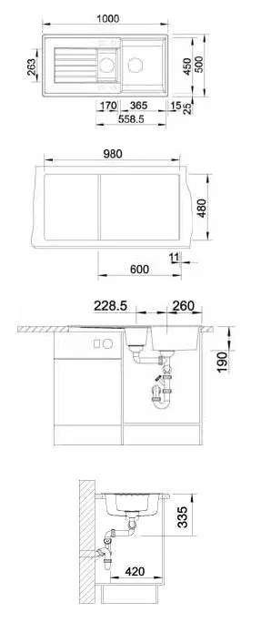 * *Враховувати ширину пристінного канта у разі встановлення мийки біля стіни або пеналу