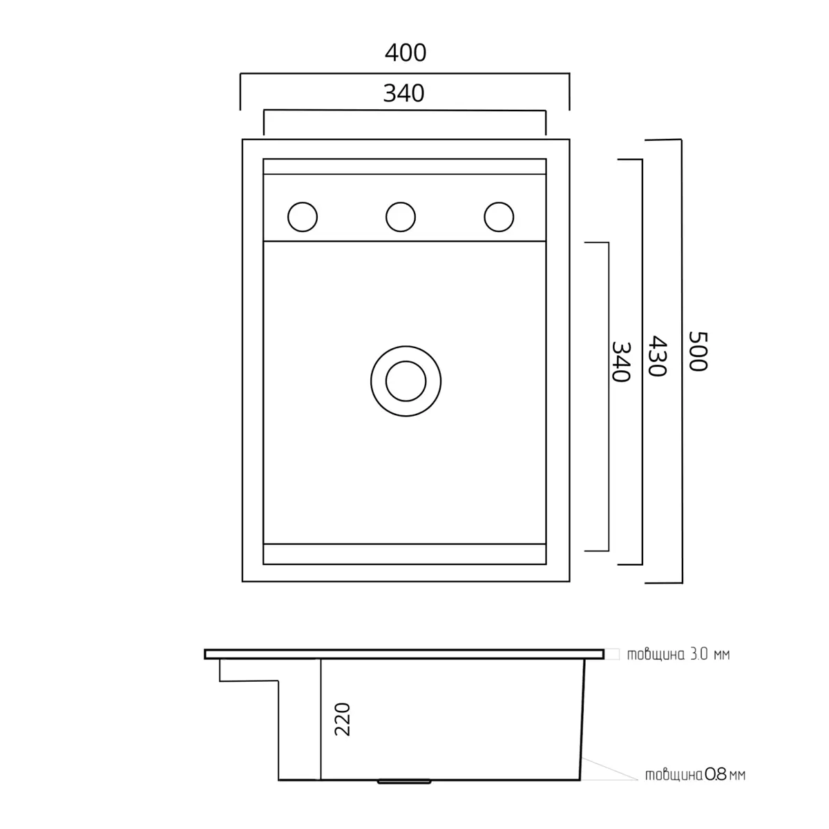 Зовнішній розмір мийки — 400x500 мм, а простора чаша розміром 340x340 мм та глибиною 220 мм забезпечує зручність під час миття великих посудин і продуктів. Мийка має товщину 3.0/0.8 мм, що забезпечує її міцність та надійність при тривалому використанні.