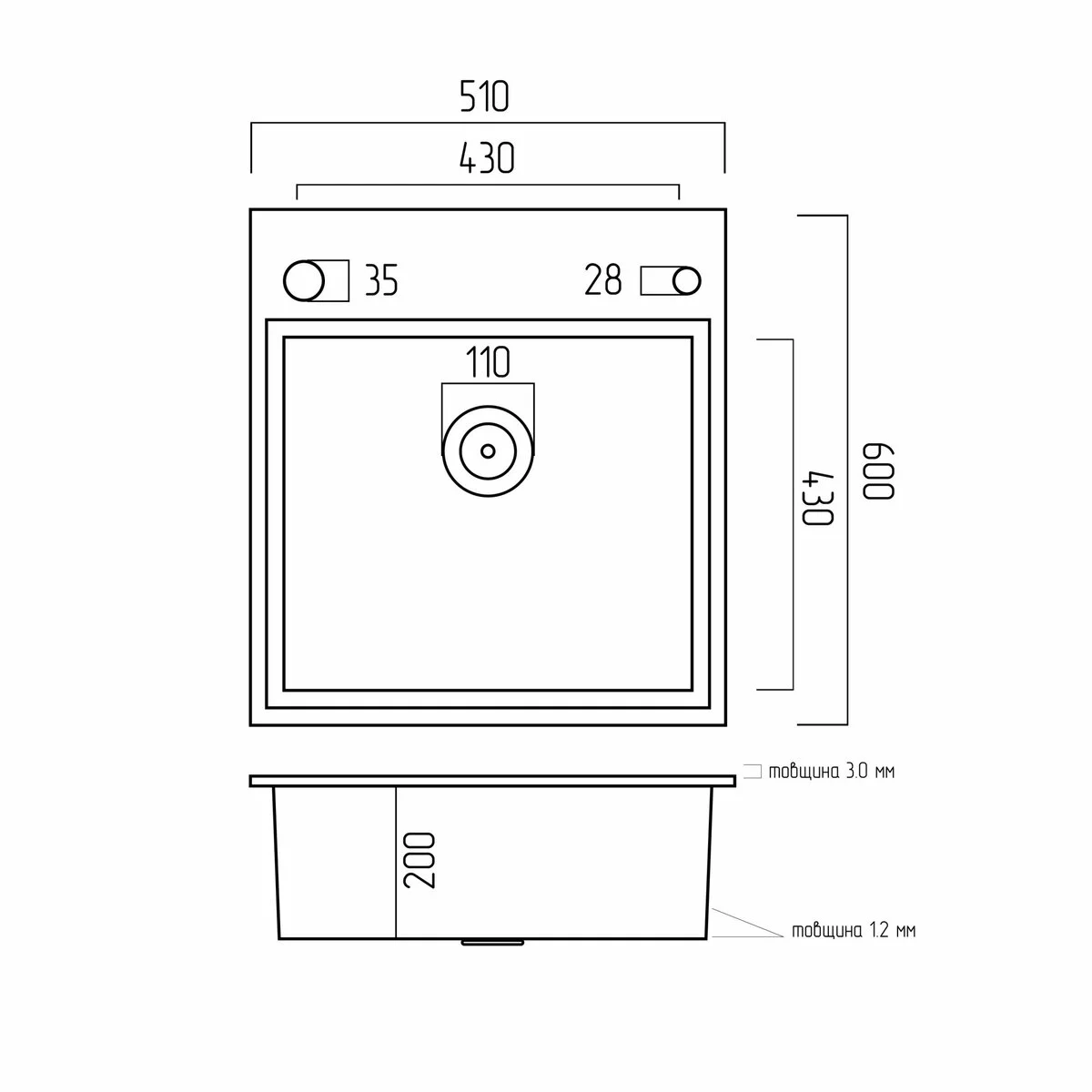 Мийка має чашу глибиною 200 мм, що забезпечує зручність щоденного використання. Тип встановлення – універсальний, як на стільницю, так і під стільницю. Для монтажу мийки потрібна ширина стільниці не менше 550 мм.