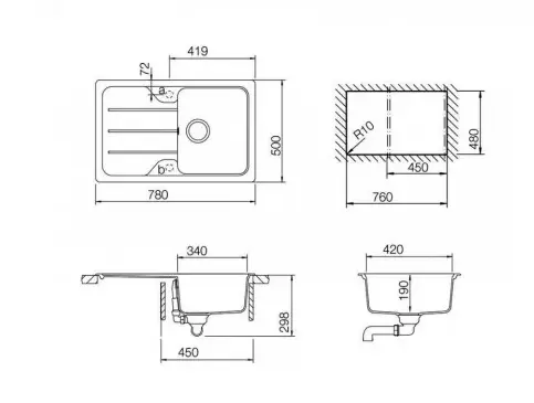 * розміри : Загальні: 780 * 500 мм, Чаша: 340 * 420мм, глибина: 190 мм ,Ширина кухонної секції: 45см