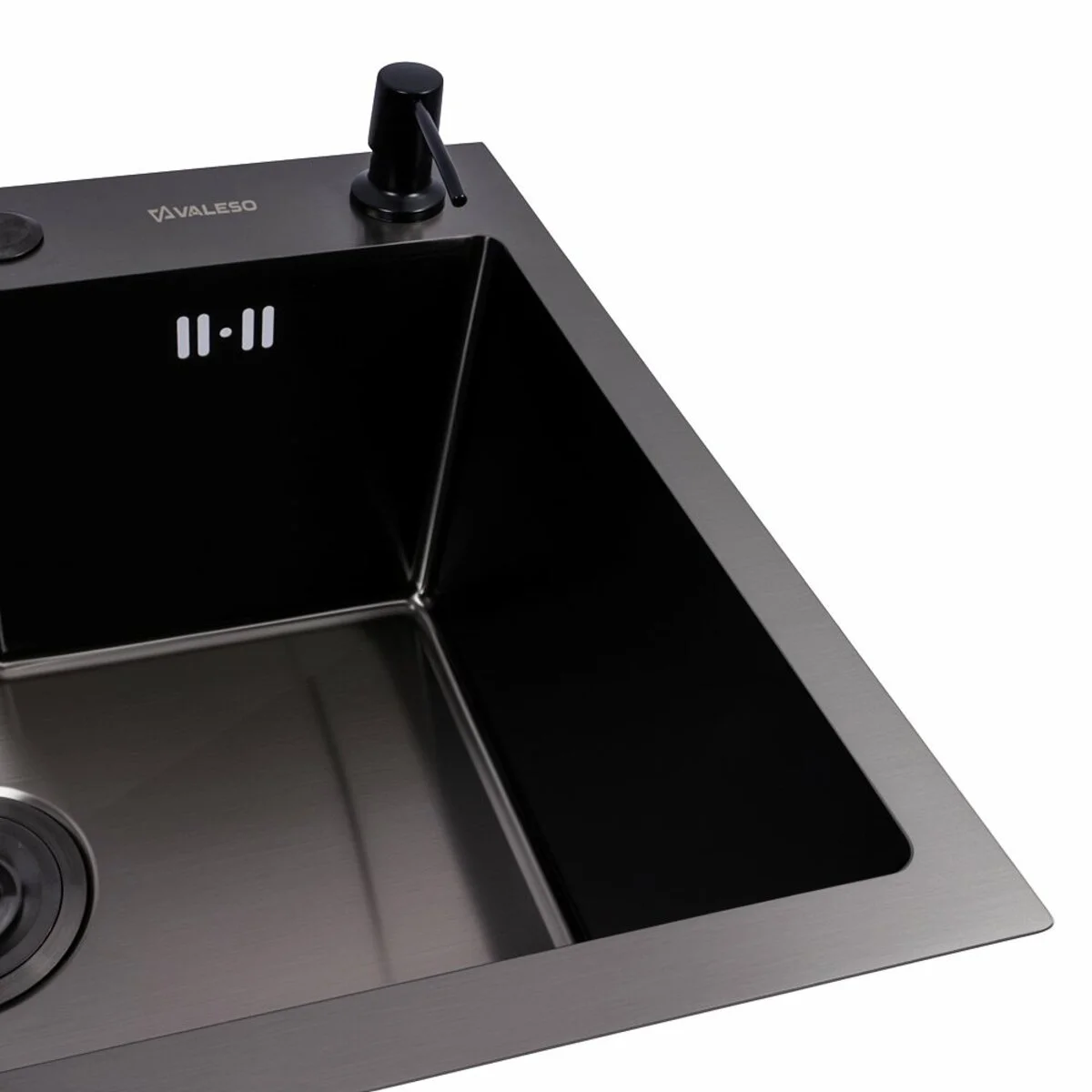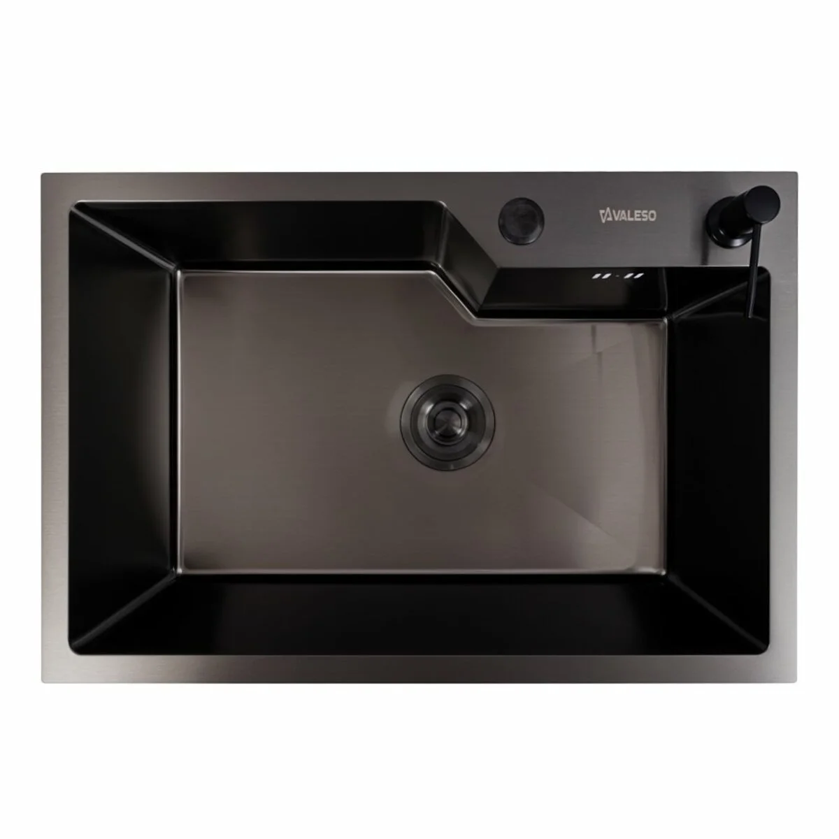 Кухонна мийка VALESO Handmade 65х43 PVD (3,0/0,8) чорна відмінне стильне рішення для кухні невеликих та середніх розмірів. Лаконічний дизайн прямокутної форми добре пасує різним інтер’єрам кухні.