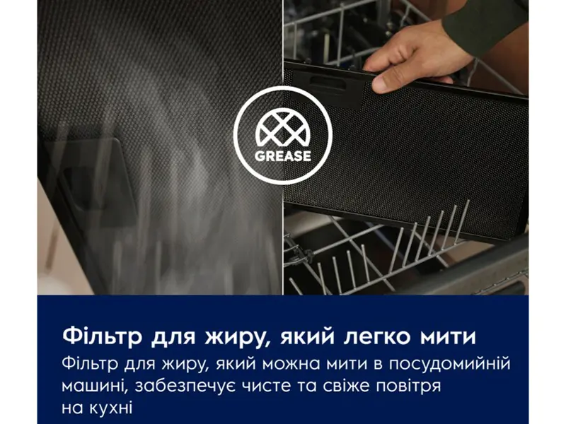 Відчуйте, як працює надійна фільтрація жиру. Наш фільтр створено для вашої зручності, адже він не лише забезпечує якісну роботу витяжки та свіжість повітря на вашій кухні, а й спрощує догляд за нею: його легко мити як вручну, так і в посудомийній машині.